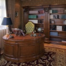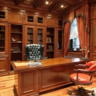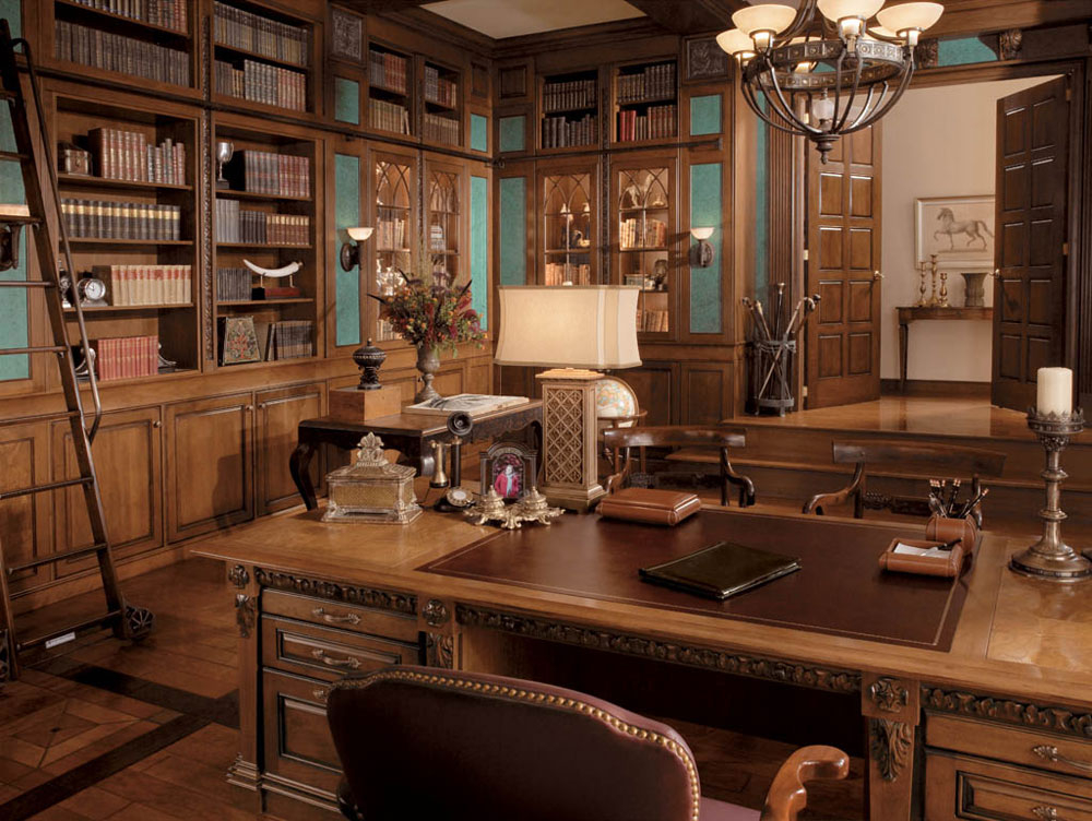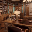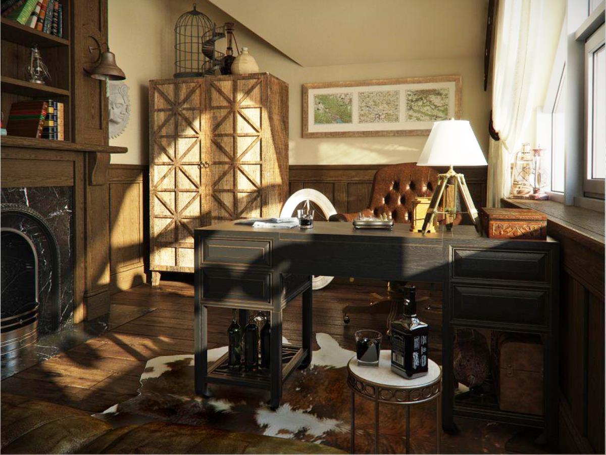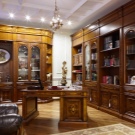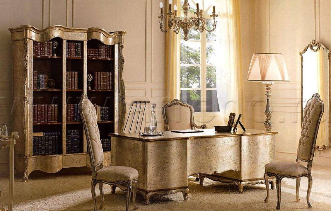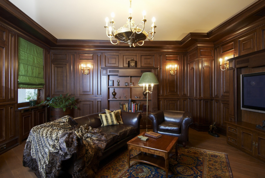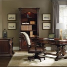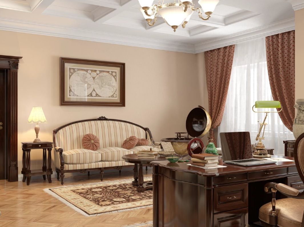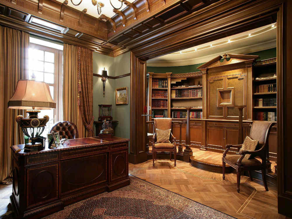 - English style. Characteristic features: furniture from a solid array of expensive breeds, upholstery from genuine leather, trimming of elements from valuable types of stone, accessories from famous designers. The classic English interior is dominated by natural shades - deep blue, emerald green, all shades of brown. This option is ideal for the head of a serious enterprise.