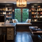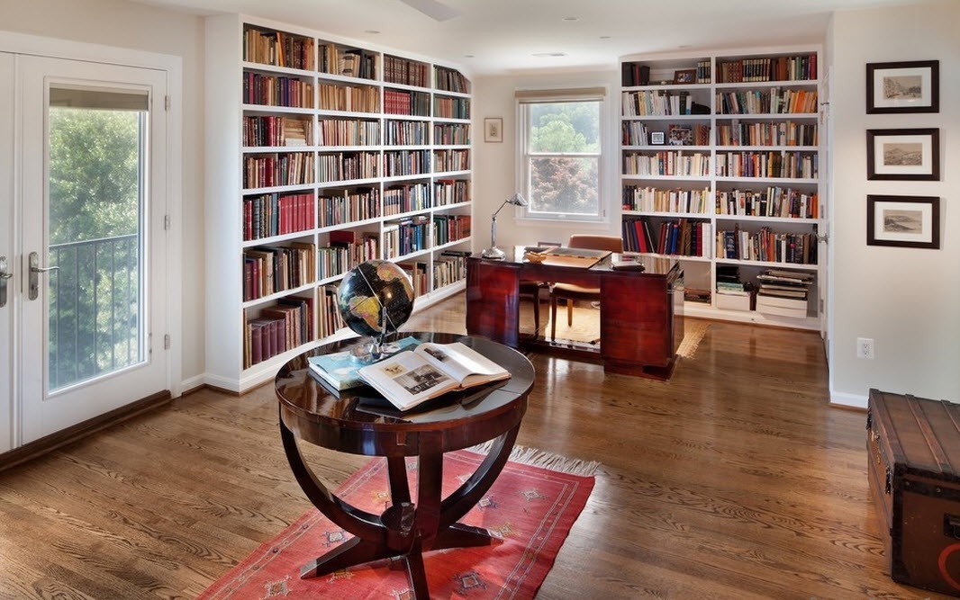 Sometimes in a country house the role of the cabinet is performed by a library, which can be used by several family members. In this case, the interior is better to do universal. For this fit white, beige or light gray. Wooden shelves for books should be combined with the rest of the furniture - a table, chairs and a sofa, if there is one.
