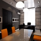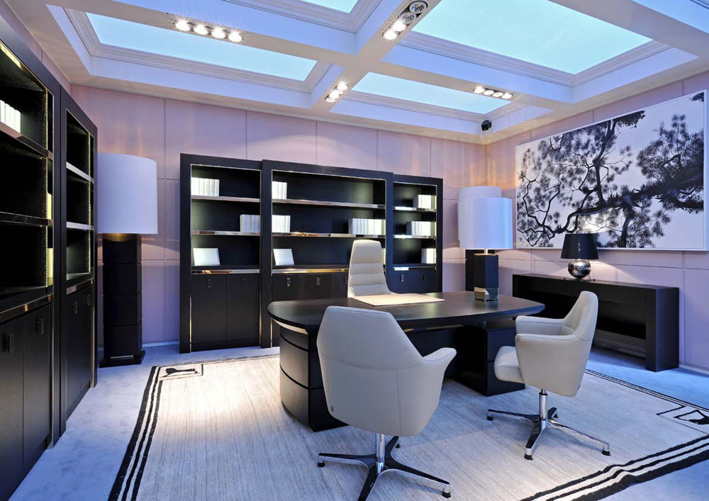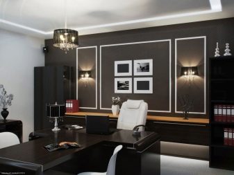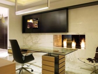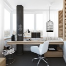 - High tech. This design is characterized by the use of all modern technological advances. The design is dominated by various combinations of metal, plastic and glass. The interior in high-tech style is quite austere. It can be arranged in light or dark shades.The characteristic colors for this interior are all shades of black, gray and white. It would be appropriate to furnish such an office with appropriate furniture: a metal rack in the color of the walls will not weigh down the space, and a coffee table with a glass tabletop dissolves in the air. High-tech is good because it is equally suitable for both spacious and small rooms.