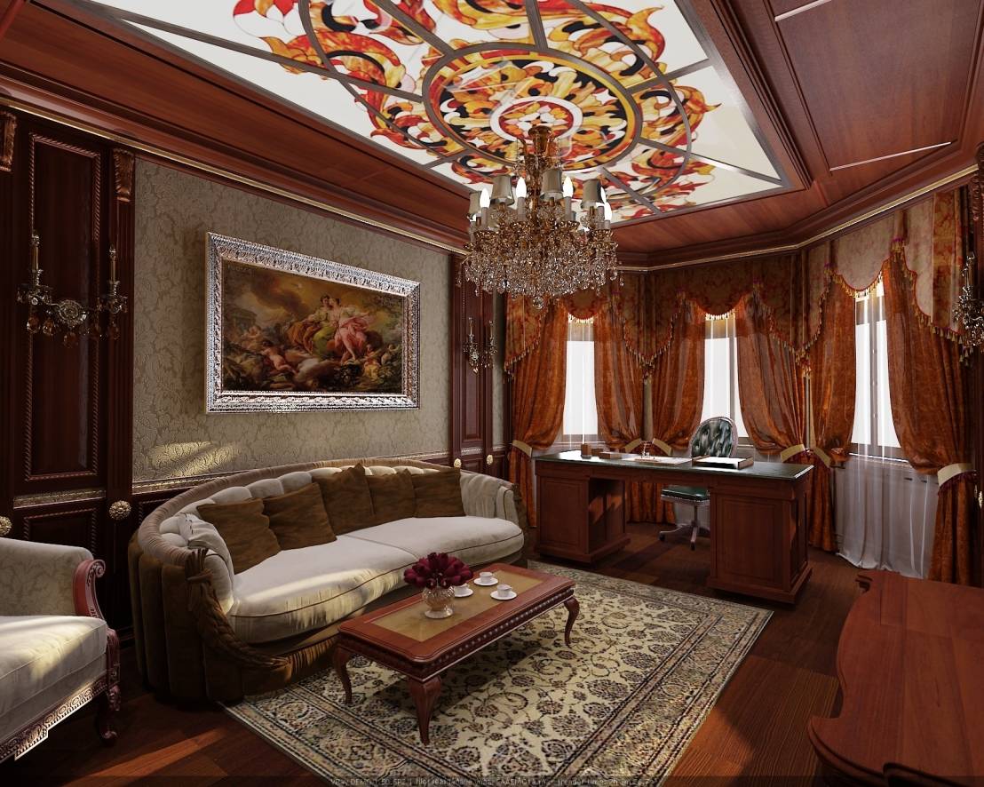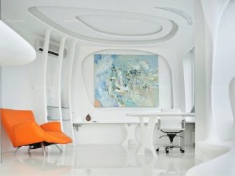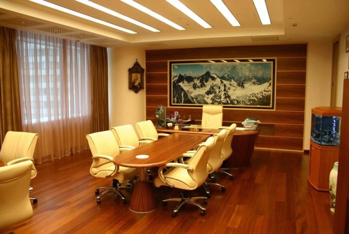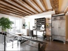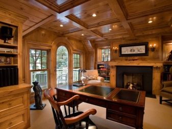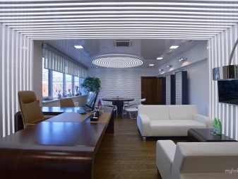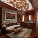 - Ceiling. If we are talking about a modern interior, then it can be stretched. High-tech style allows for the presence of printing on the ceiling - the plot should also be on modern themes. For a loft, you can make beamed floors of wood. In the classic interior these beams must be beautifully finished with varnish and gloss added to them. Suspended boards or plastic panels are traditionally used for the ceiling of an office space.