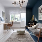 - Lighting and accessories. There should be several sources of light. And even if the room has a large window and it faces the sunny side, you cannot do without a ceiling chandelier. Sometimes one central luminaire is replaced with several ones built into the ceiling. It looks very stylish hidden lights in multi-level ceilings. If there are photographs, posters or paintings on the walls, individual light sources can also be arranged above them. And, of course, do not forget about the desk lamp.