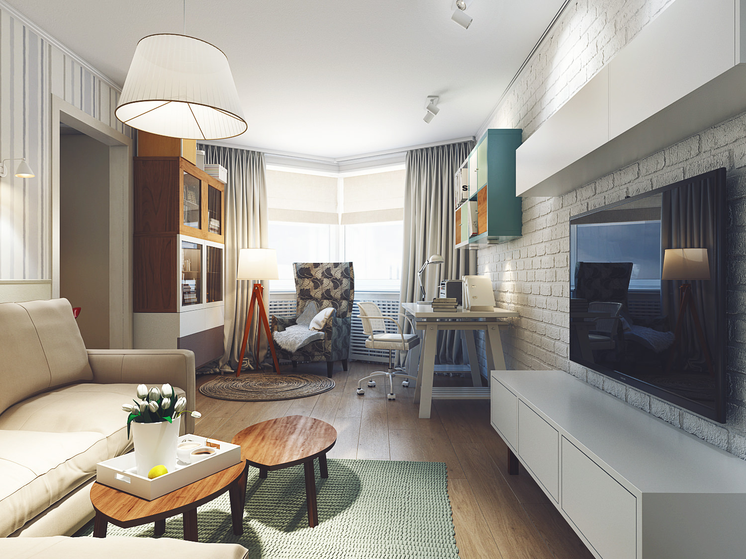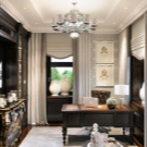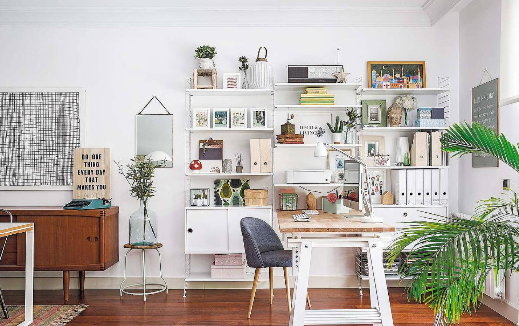 - Scandinavian. It is often used for finishing houses. Therefore, it will be appropriate, above all, to design a home office. For the Scandinavian interior, the characters are bright: all shades of white from cold snow to the color of melted milk, light gray, young green, beige and brown. For windows, it is best to use fabric blinds, and furniture to choose from natural materials or their imitation.This design is the best suited for the female office, but this does not mean that it can not be used for men's interior.