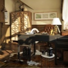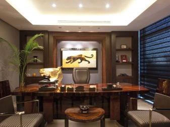 - Decorations. Depending on the type of activity of its owner, the office can be decorated with some decorative objects. For example, if the owner of the premises is keen on hunting or fishing, you can place several trophies or photos with prey on the walls. Or, if a person loves music, you can arrange disks on your shelves with your favorite compositions or hang posters on your walls with images of your favorite artists.However, in everything it is necessary to observe a sense of proportion - nothing should be too much, all the excess relaxes and distracts from work.