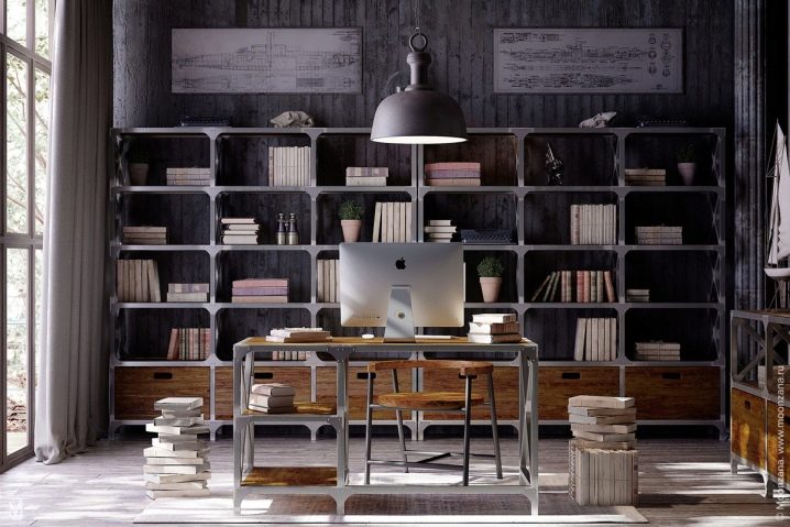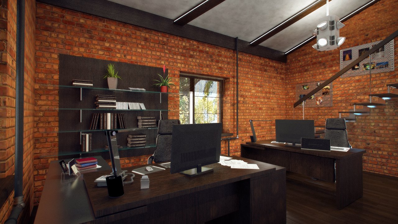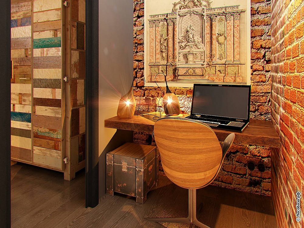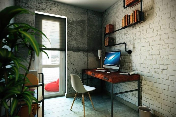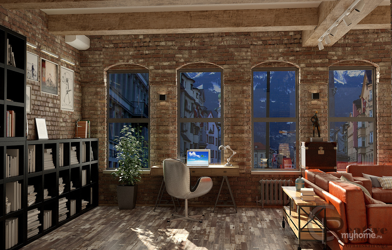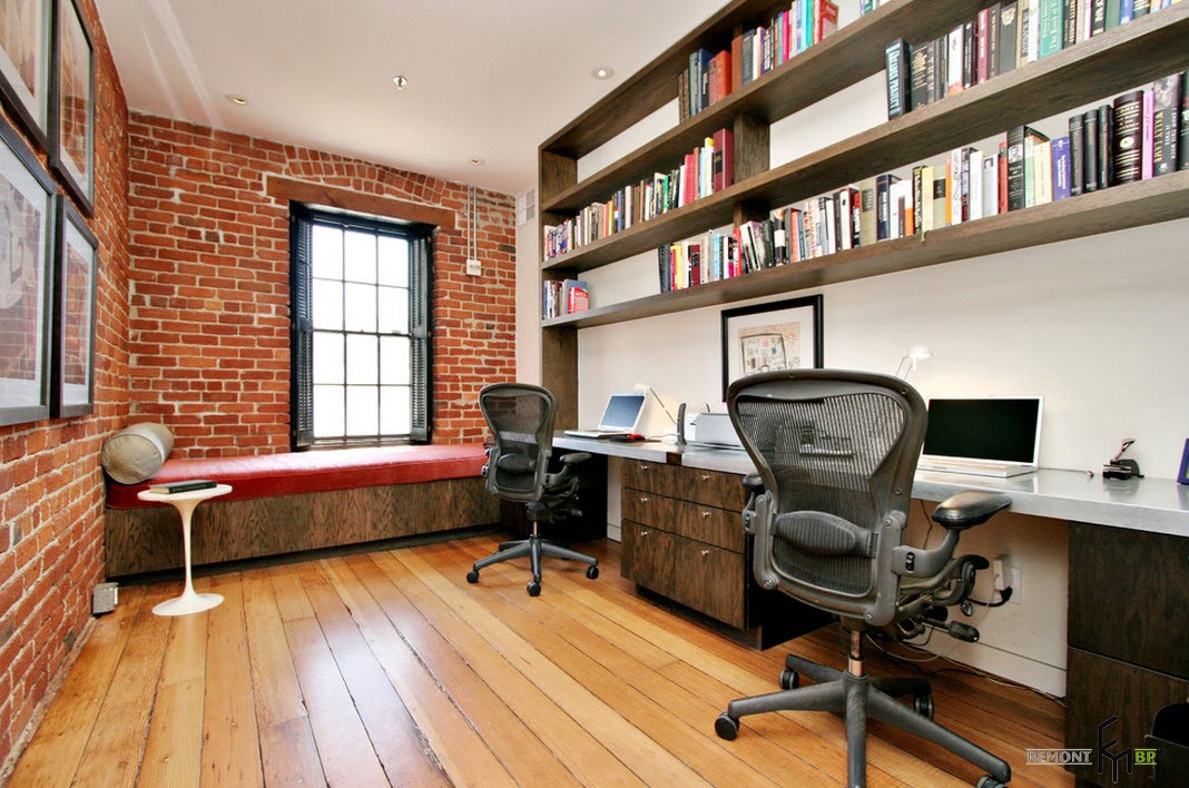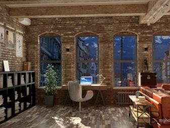 In the office in the style of loft about the finish you can not worry at all. You can leave the raw brick wall or just cover it with a layer of plaster. To improve the interior a little, you can use decorative plaster or brick imitation.