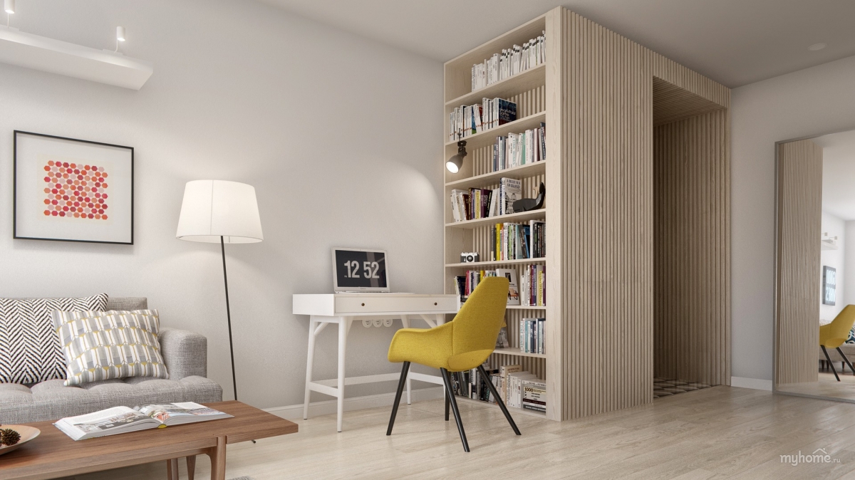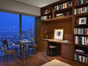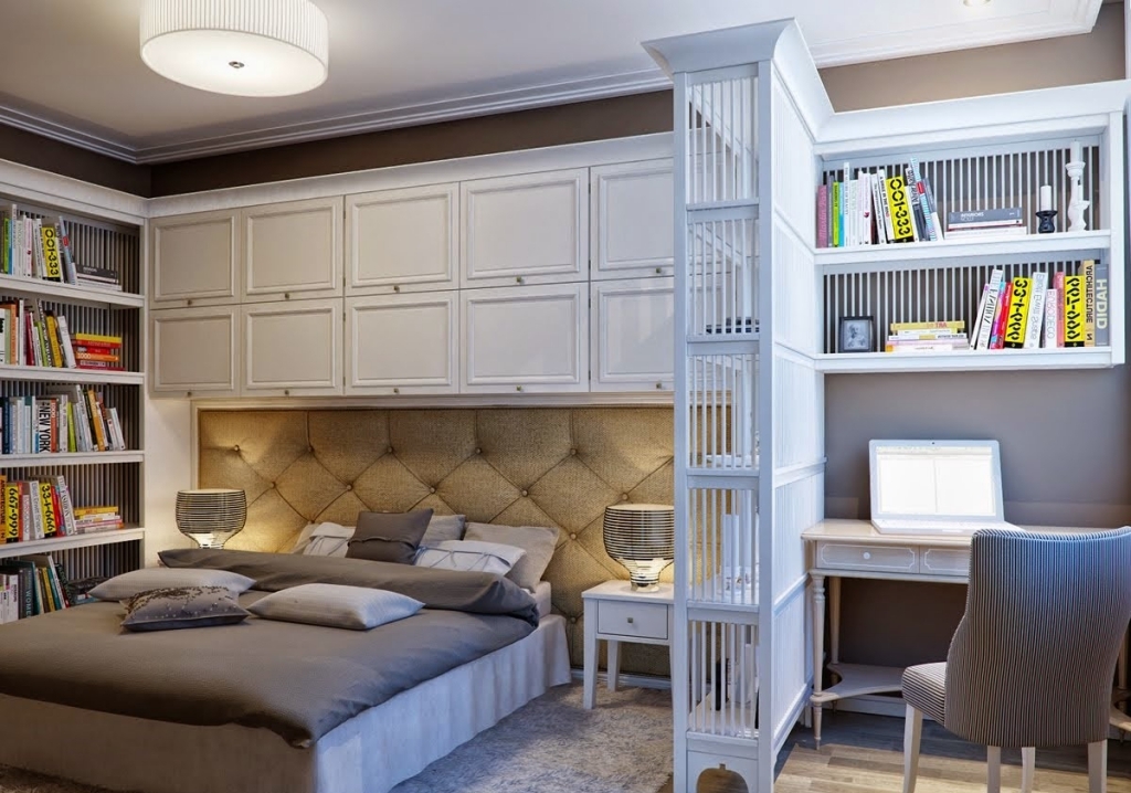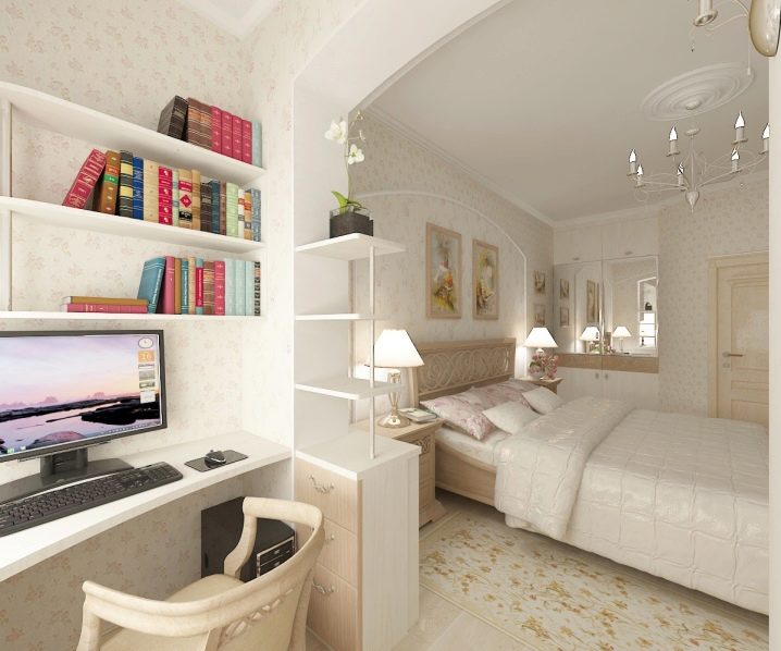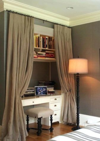 If the office is a part-time and matrimonial bedroom, it is necessary to arrange the lighting so that the person who works does not interfere with the one who wants to rest. To do this, it is desirable to isolate one area from another with a high cabinet, and provide additional lighting near the table.Another option for the partition is a plasterboard construction with built-in niches for books and other items. Sometimes in a small room you should not do any partitions and it is more expedient to arrange furniture around the perimeter. So the integrity of the space will be preserved and there will be more room to move.