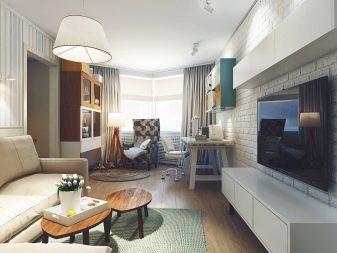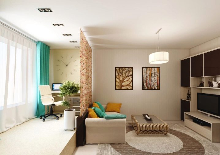 It is possible to divide the room into functional zones with the help of finishing materials. In the recreation area to lay carpet, and for the working space to use laminate or tile. On the walls, you can glue wallpapers of different colors or different designs. It is possible to dissociate oneself from those around you with the help of a sliding partition or roller blinds.