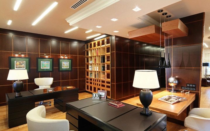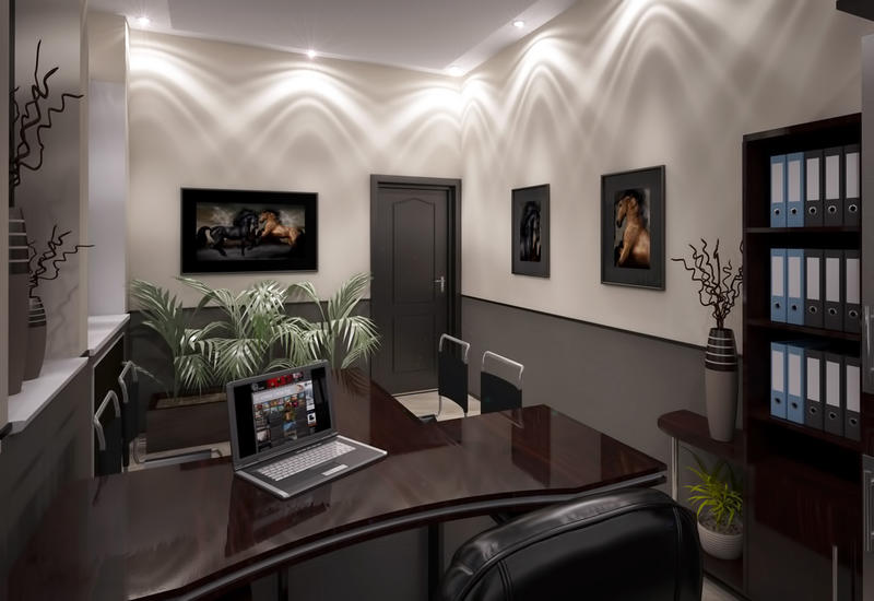 Any design begins with the planning of the situation, and any planning depends on the size of the object. If the room is in a private house, then it can be a large room. In this case, you can use more opportunities for its arrangement. Such an office can, for example, be divided into functional zones with the help of various techniques, to put more comfortable furniture, or simply add more items.