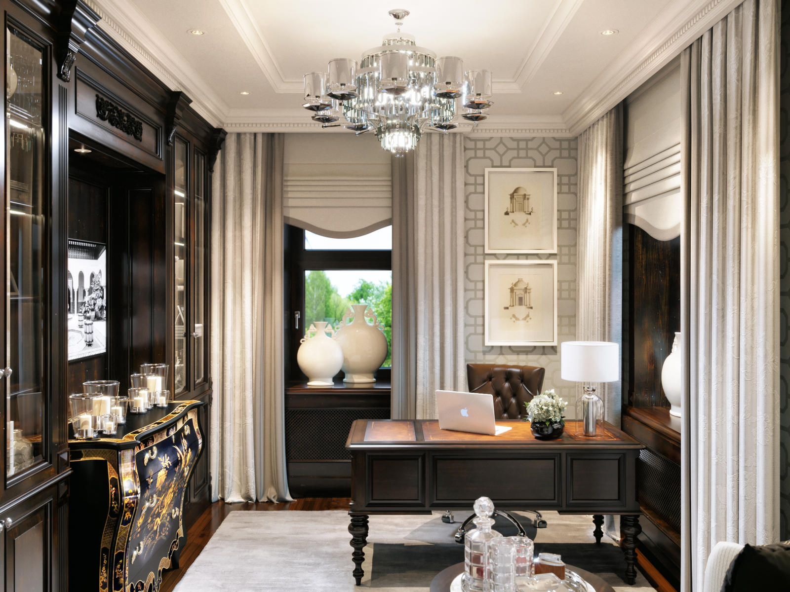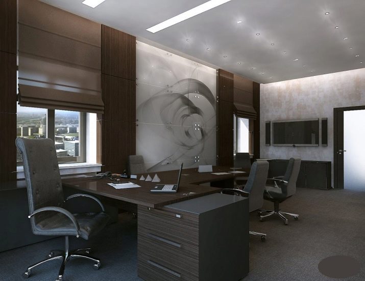 The style of the office for a man and for a woman may vary. The design of the male cabinet is usually more restrained and more functional. The interior is often present in gray and brown tones. It can be plain wallpaper for painting or decorative plaster. If there is upholstered furniture in the office, then with a simple and clear pattern.Usually it is a cell or a strip. Curtains on the windows are often missing, giving way to plastic or fabric blinds.