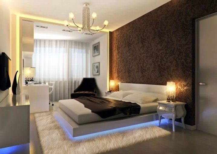 Traditionally, lamps are placed on top. However, you can slightly create and fix the LED strip along the lower perimeter of the room. Especially beautiful it will look in the office-bedroom.
