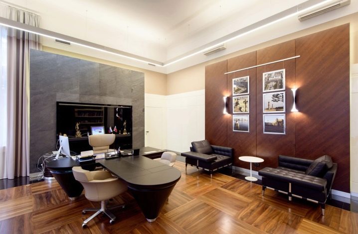 If we are talking about a home office, you can use parquet or carpet under the plinth. The carpet looks very respectable on the parquet floor, with which you can also zone a room. It will soften unnecessarily official style and make the interior more comfortable.