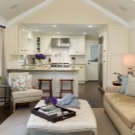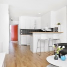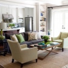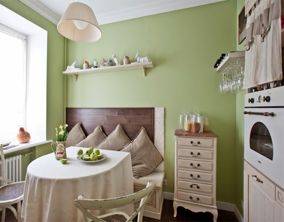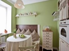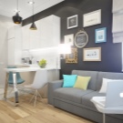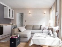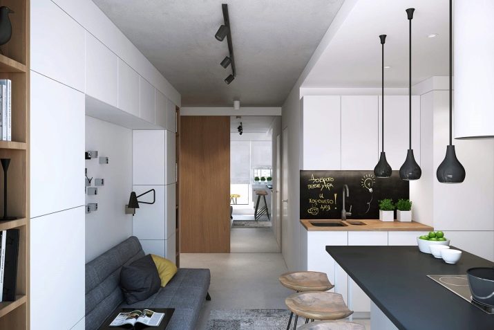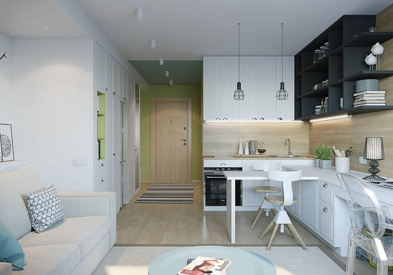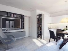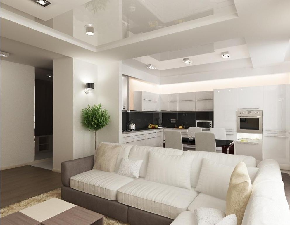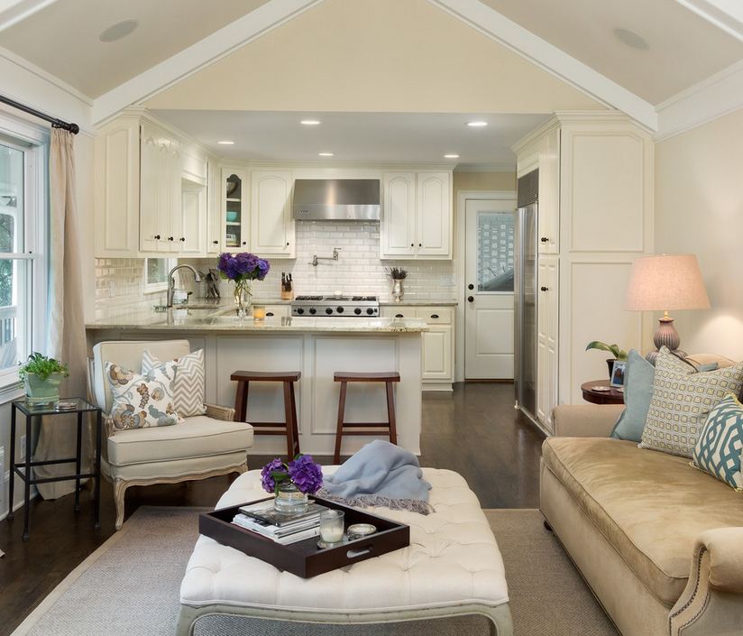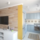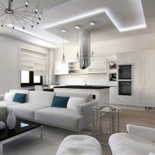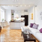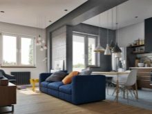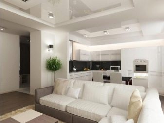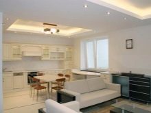 - kitchen-dining room. To combine the three zones in the same room, it is necessary to demolish partitions or equip an arched doorway. On the line of separation of the room and the kitchen or in the room is a dining area with a soft sofa or a bar with high chairs.