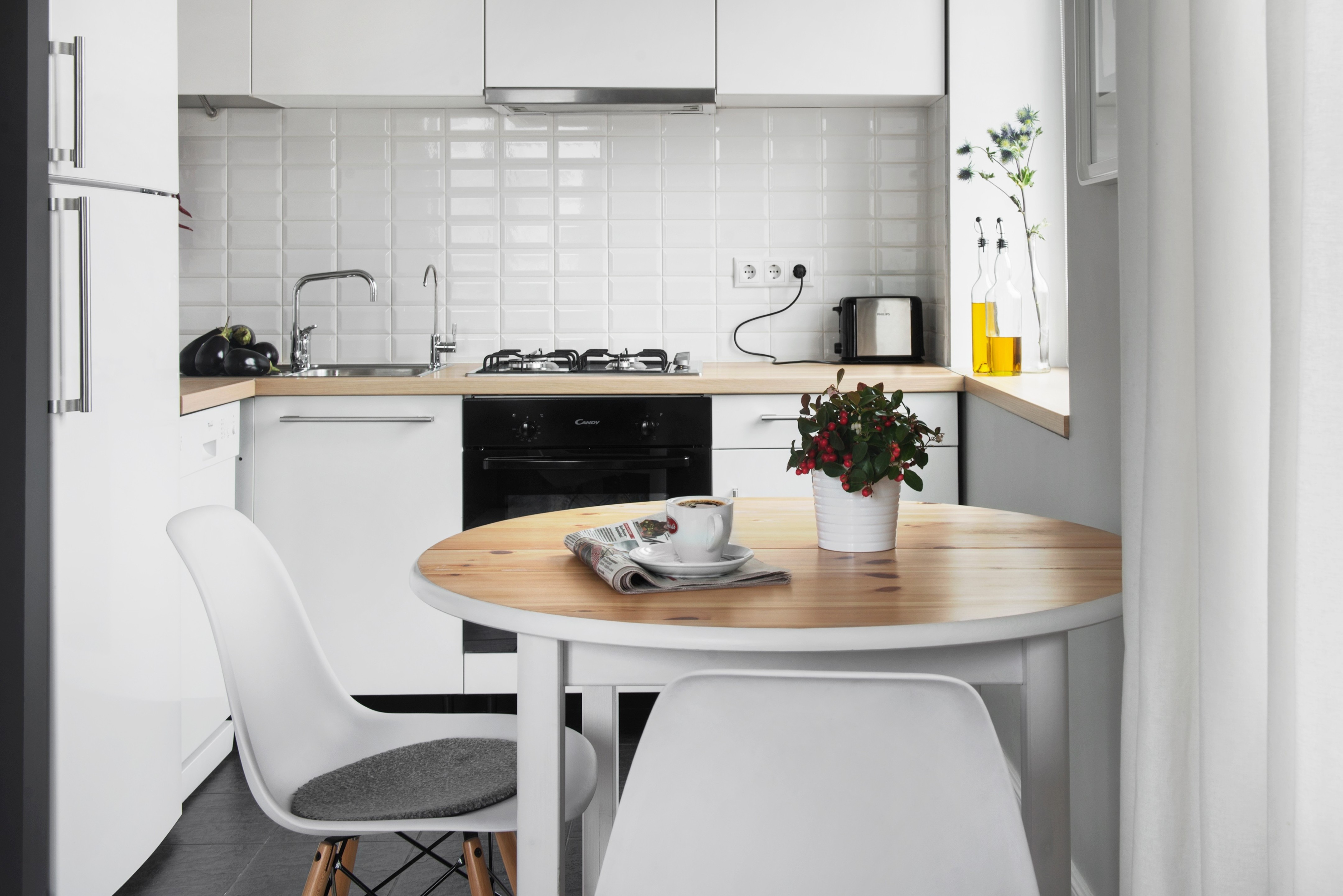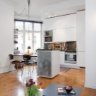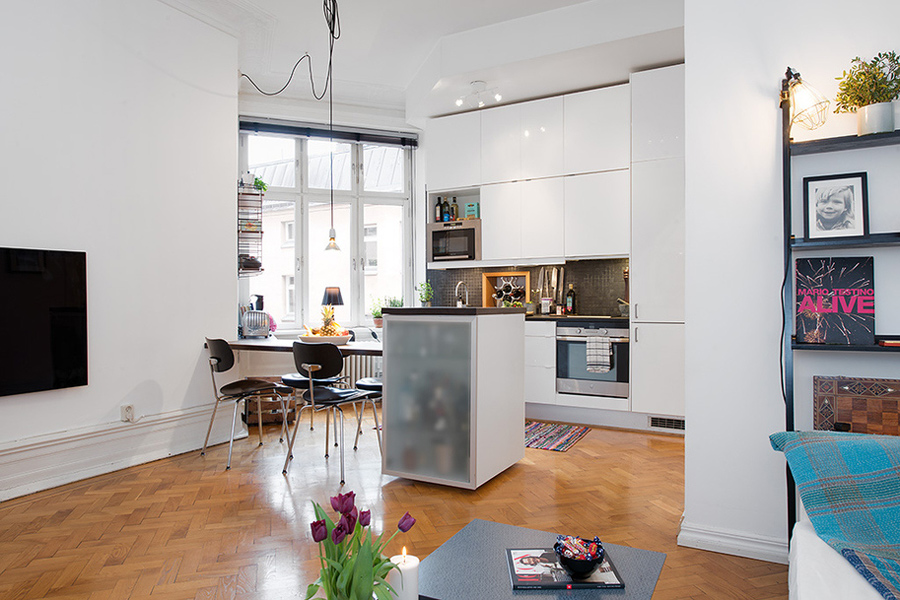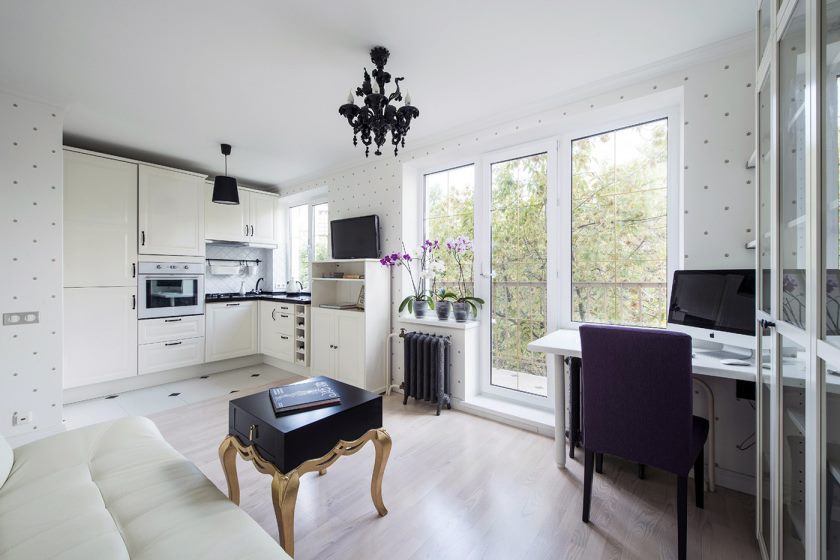 Features of the apartment do not provide an opportunity to move the kitchen to another place, but you can bring the dining area to the living room.To do this, you can tear down the partition between the kitchen and the room or make an arched opening. Such a wide passage visually separates the space and creates the effect of increasing the area. Instead of a large roomy table, you can leave a place in the kitchen for a bar, behind which you can comfortably accommodate up to 4 people.