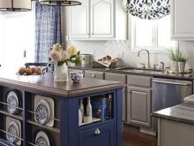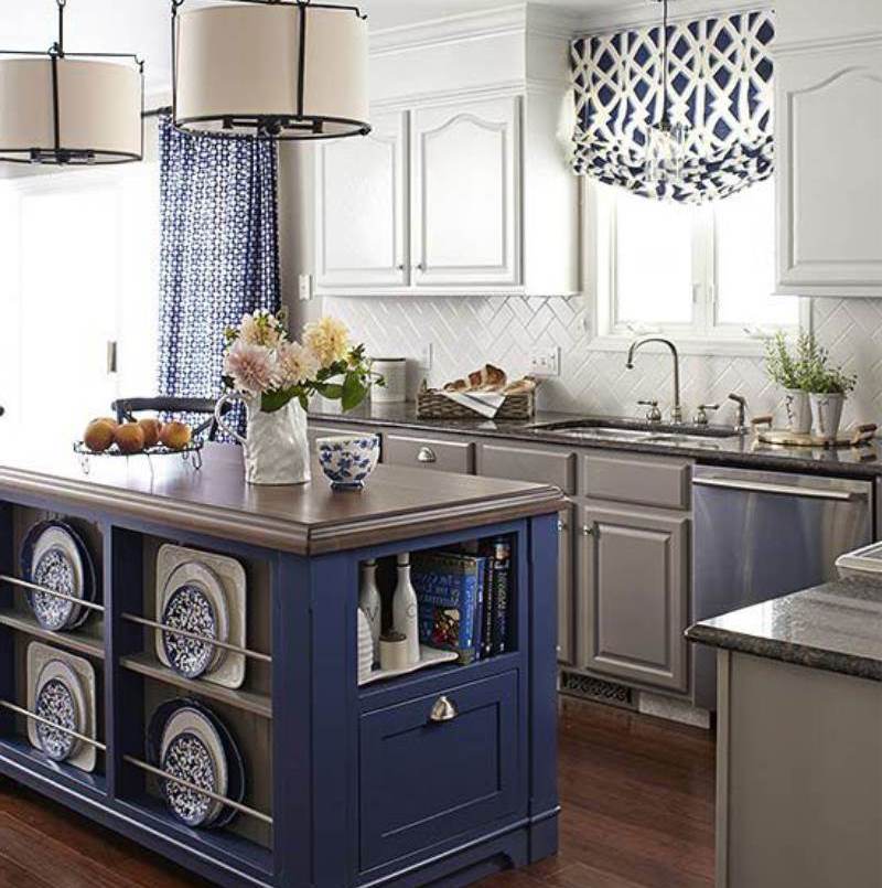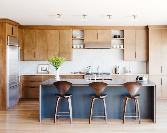 The combination of beige, brown and rich blue looks harmonious and attractive in the interior of the kitchen-living room.