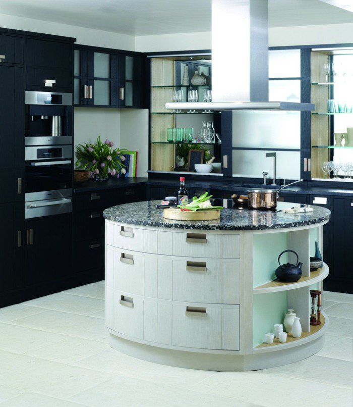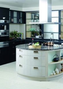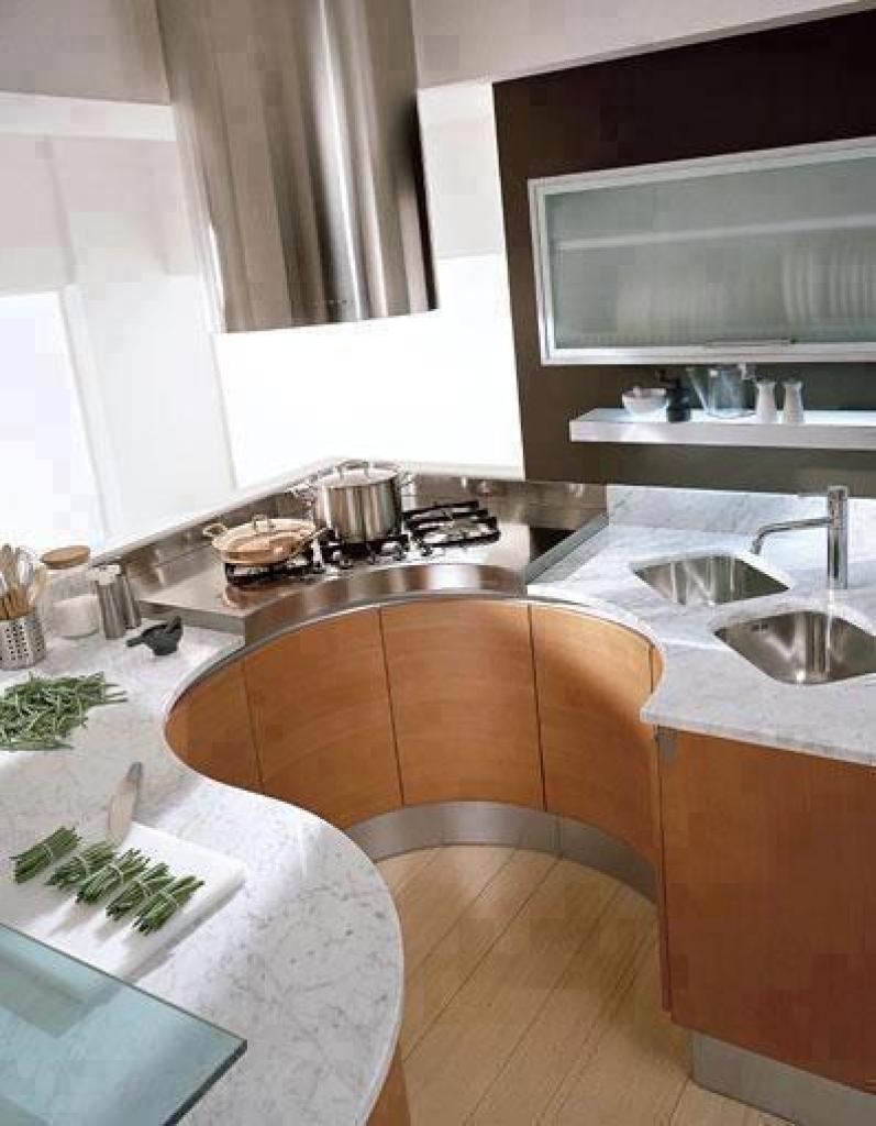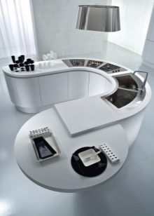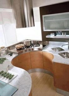 When working on the arrangement of the kitchen should not be afraid of bold decisions. The set with a round shape combines convenience, functionality and style. At the same time it is located on an area of 8 square meters.