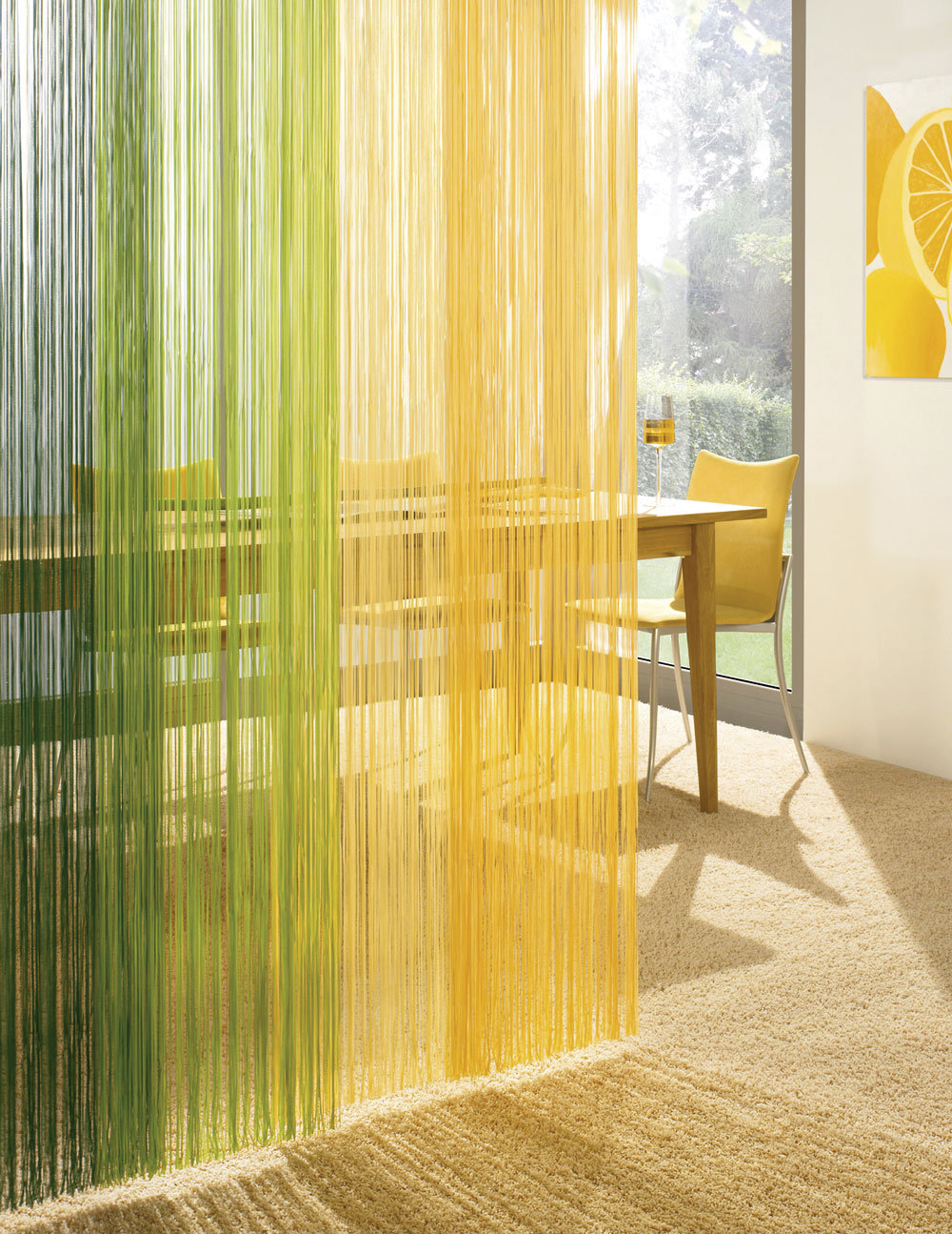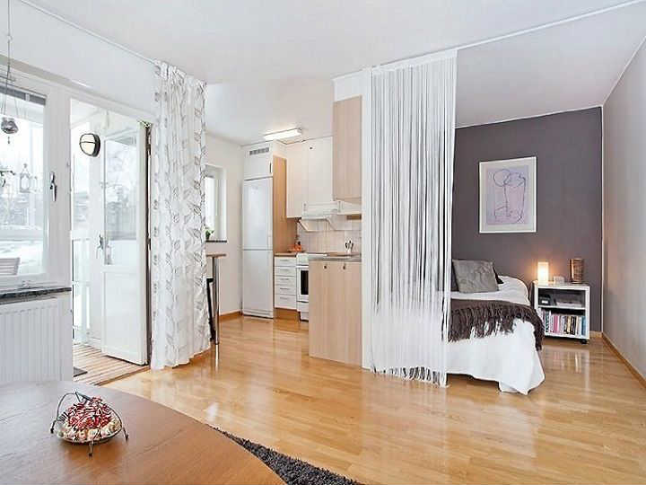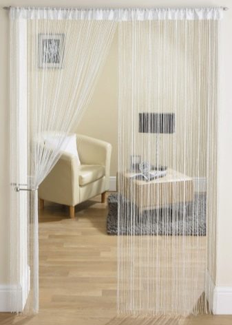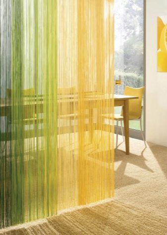 For zoning a small room are great curtains-thread. This option refers to the economy class. They perfectly let in air and light, take up little space, and at any moment they can be removed by making the room even bigger.