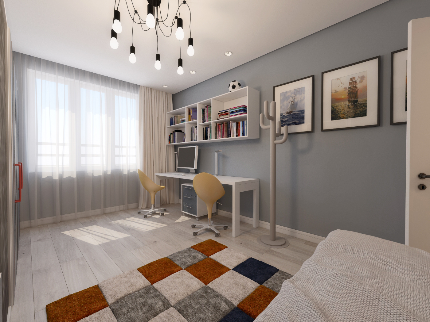 - If a child lives in the room, then you can put a bed, a desk and a wardrobe, while remaining free space for games.If there are two children living in the room, it is better to choose functional transforming furniture or a bunk bed. A window seat can be equipped under the desktop, so that for each child there is a separate area for study.