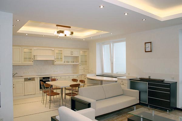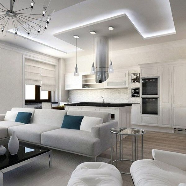 The color of the ceiling must be close to white.Psychologically dark shades will crush, visually reduce the height of the ceiling. It also looks great multi-level ceiling with spot built-in lights. Bright lighting and complex structures will visually “lift” the ceiling and expand the space.