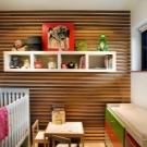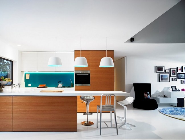 The combination of wooden coatings and white glossy panels gives the room conciseness, and bright furniture completes the extraordinary image of the “studio”. Designer ceiling complex layout visually expands the space of the room. This effect complements the built-in lights. Laconic and clear contours soften the use of green, upholstered furniture round shape.