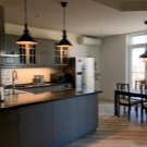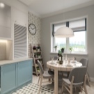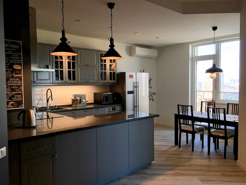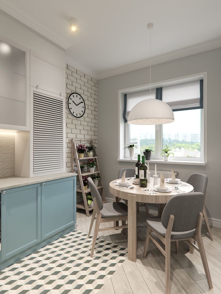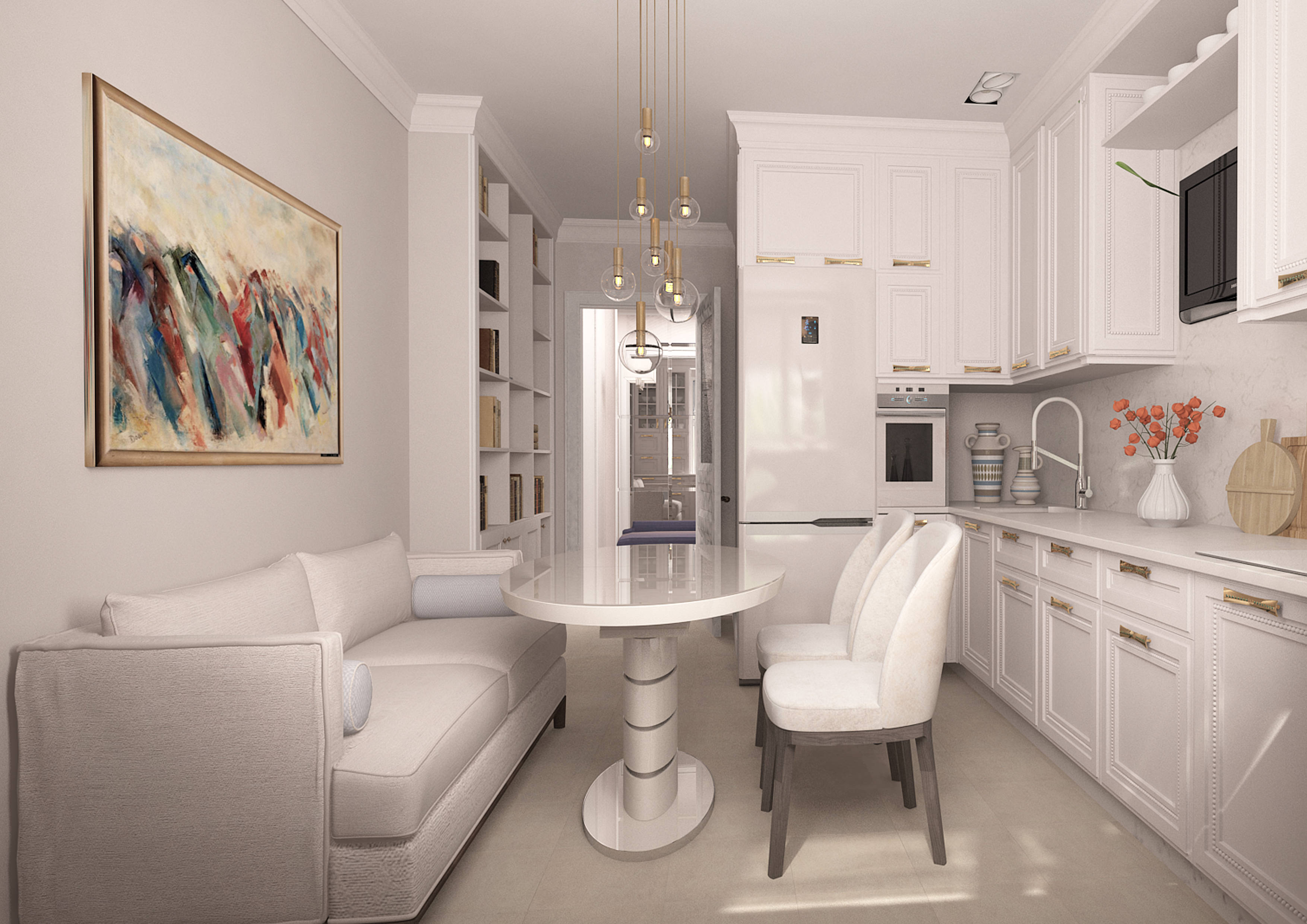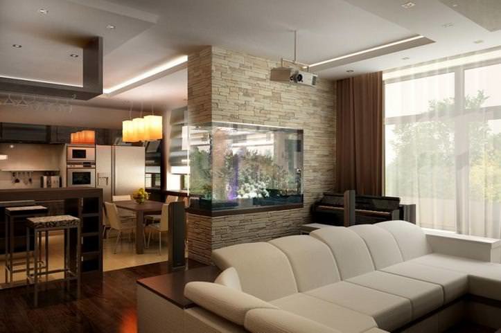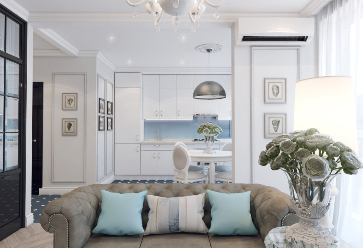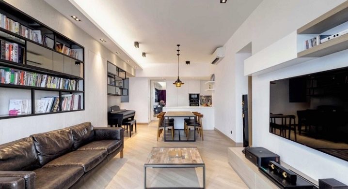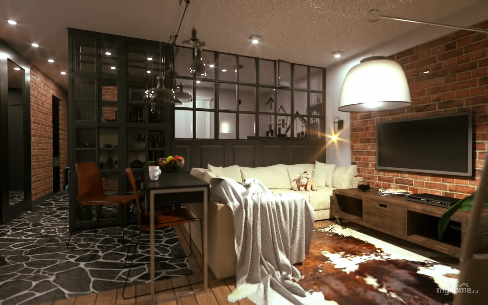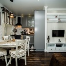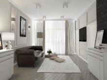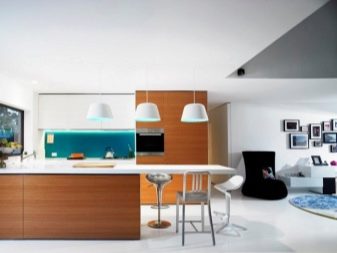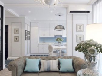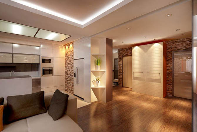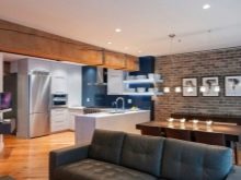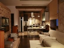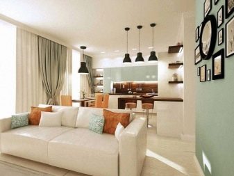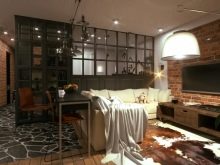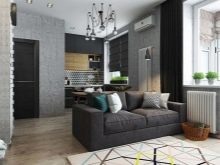 In order to get a “studio” from such apartments, the kitchen is connected to the adjacent room, and the functional areas are separated with furniture and lighting.