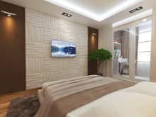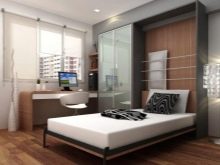 The writing table, if necessary, is moved apart and transformed into a full-fledged dining table. The bed can be folded and hidden in the surface of the closet. Above the bed to the ceiling mounted TV with remote control.