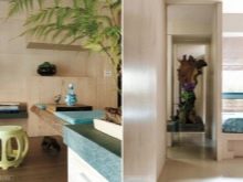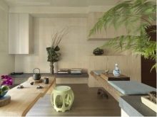 The design of the "dvushki" from the talented Thai master Wu Chengksiana maintained in the traditions of the culture of the countries of the East. The minimalist setting is complemented by laconic accessories made from natural materials. Natural green shades have something in common with blue marble tiles.