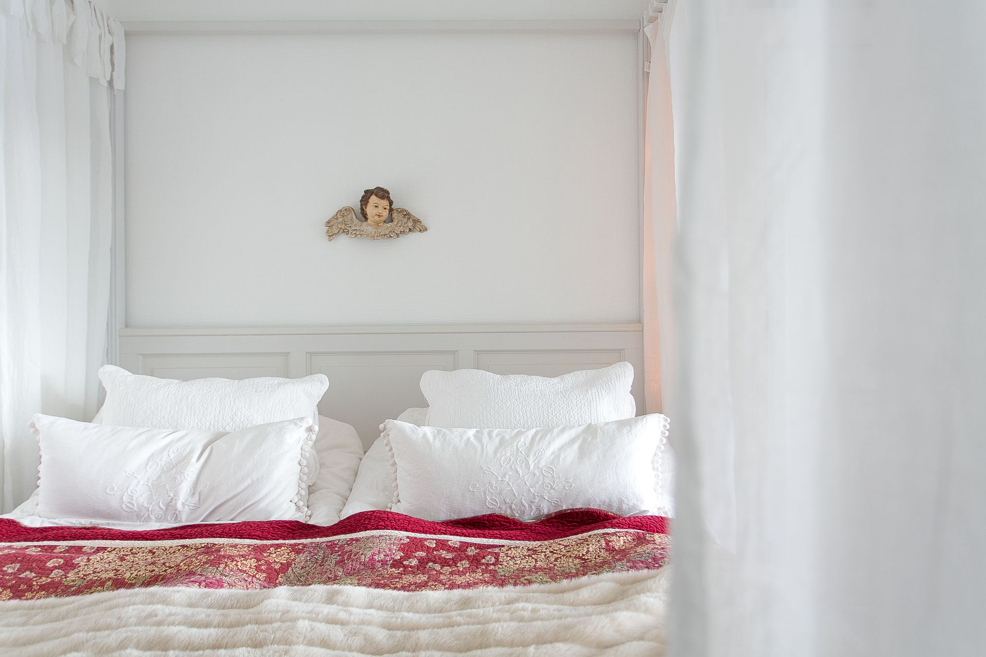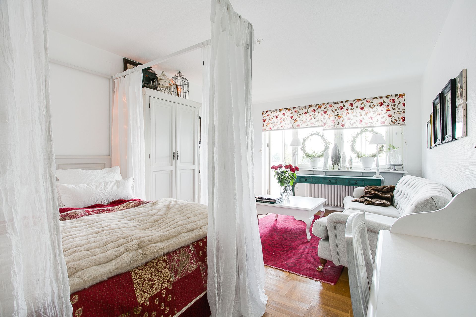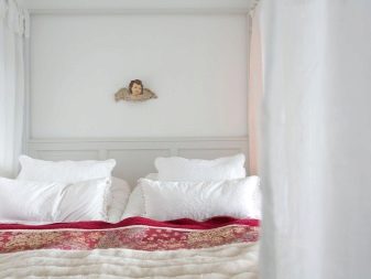 The owners of the apartments completed the functional zoning of space. So, the child’s bed is fenced off with a curtain. Romantic style of the interior is created due to the predominance of light color palette and furniture of unusual shape.The use of bright color accents complements the image. This color symbolizes confidence and steadfastness. The ceiling and walls are trimmed to visually stretch the space.