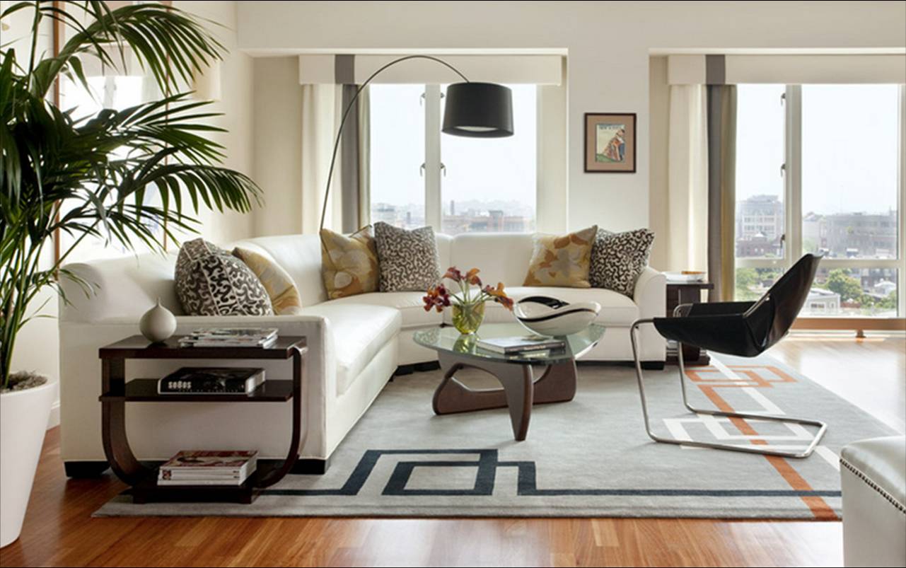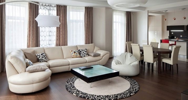 One of the distinguishing features of modern design is the maximum illumination of the apartment. Experts advise to install huge windows. Such monumental openings create a feeling of lightness. The use of monochromatic decoration of light colors: beige, white and peach will help to expand the space. It is impossible to imagine a modern interior without the use of a bright accent spot.