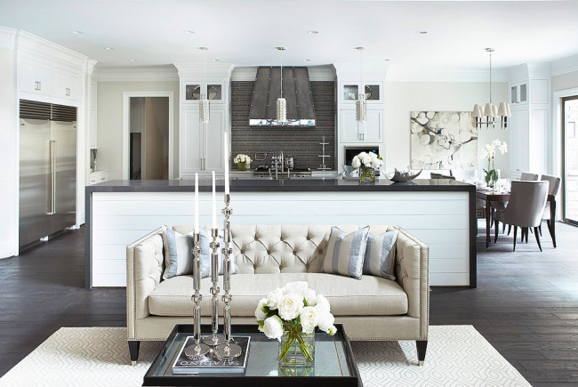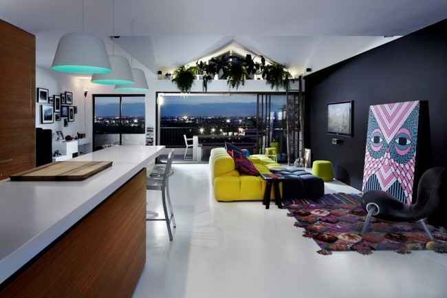 The interior is made in the contrast of colors, with strict strict lines. This style is not without the decor of lively greens to soften the hard contours of furniture.Foliage gives the interior an atmosphere of calm and comfort. Large window openings fill the room with light, and space - with air.
