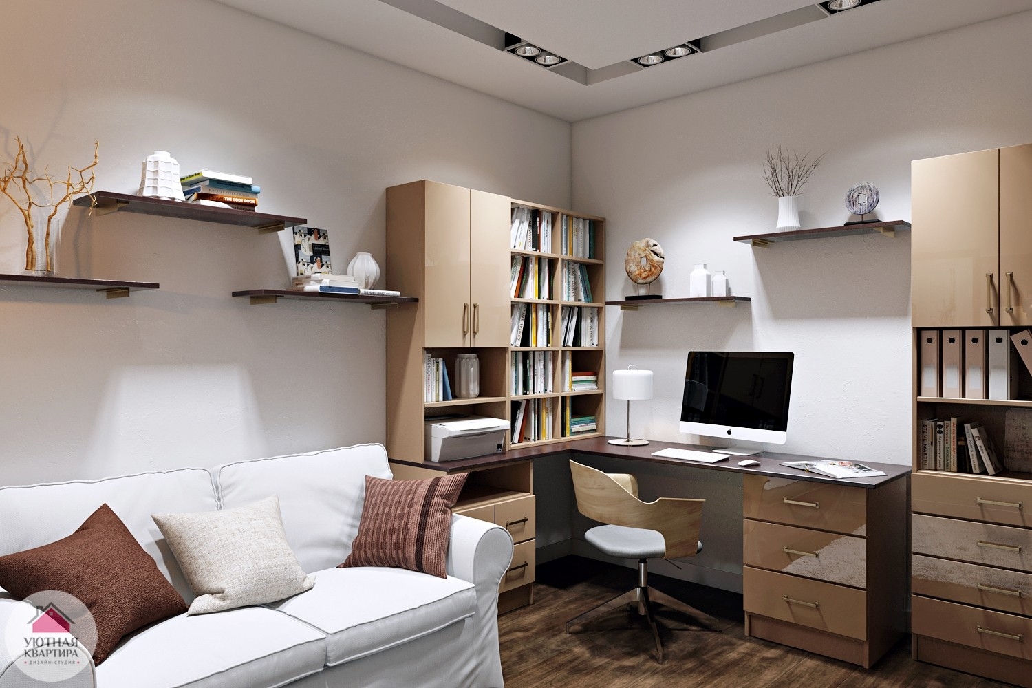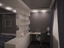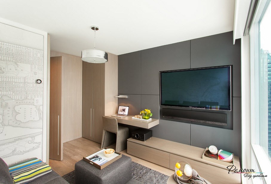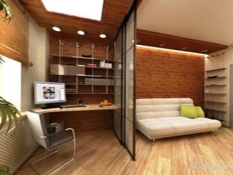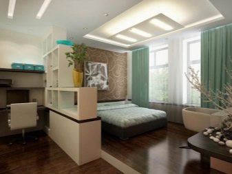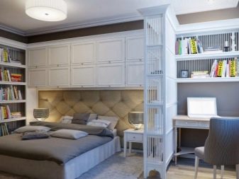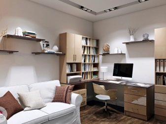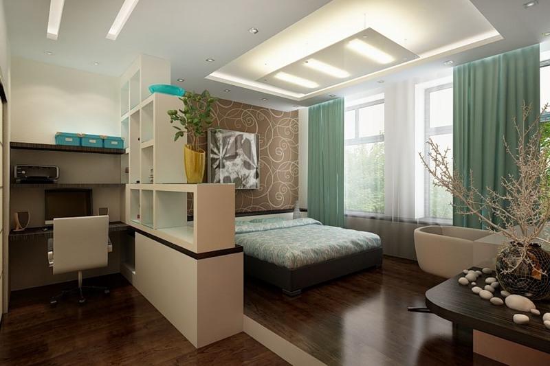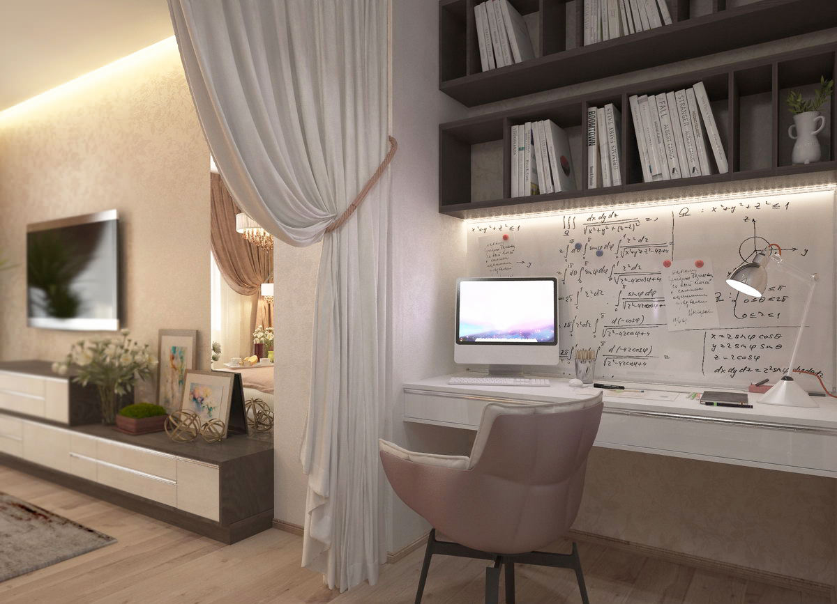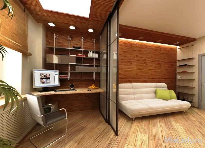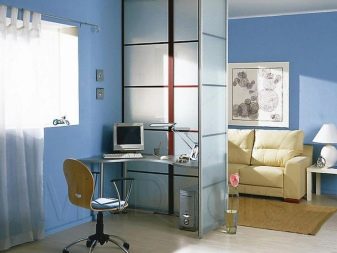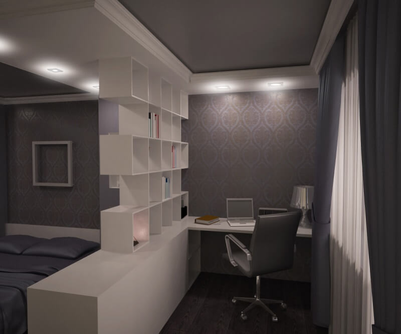 Partitions, screens, sash coupe type will help to organize the perfect workplace in one of the rooms. It is desirable that none of the clients, colleagues during the conversation saw the bed: this is personal. The dresser behind the back, the mirror can distract from the discussion of important issues. Behind the back can be a coffee table and armchairs, as well as a sofa.