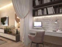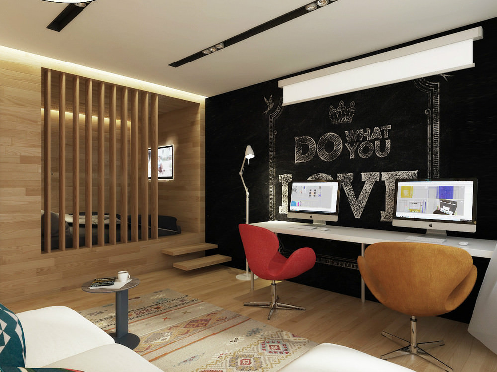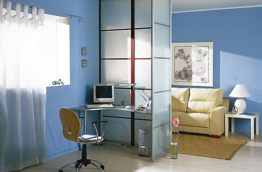 Lighting matters. Sometimes you want to buy a desk lamp, a sconce or a floor lamp, change the wiring if it is a cozy room, a small workshop with four walls and a door. The partition, a screen will help to change the design inside your own room. If the whole apartment is in the possession of one person, the workplace can be allocated with the help of a partition solely for the sake of aesthetic pleasure, so that it is easier to remain neat and disciplined. Zoning will emphasize the importance of work.
