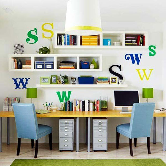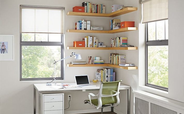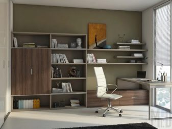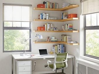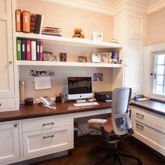 In the office, employees often do not have a large number of shelves. All papers are organized using folders, binders, archives. Photos, vases of flowers, toys and other pleasant things are now appropriate to put nearby to improve your mood. To do this, be sure to install the shelves. This can be a whole closet half the wall height or a hinged version (half the wall width).