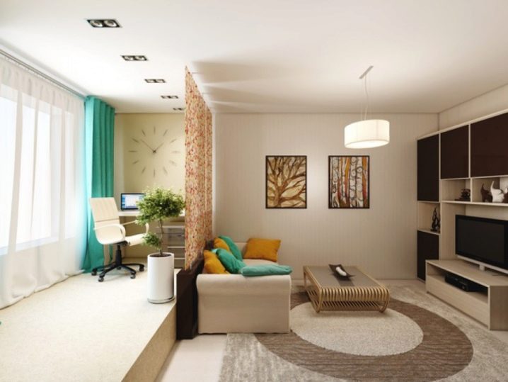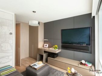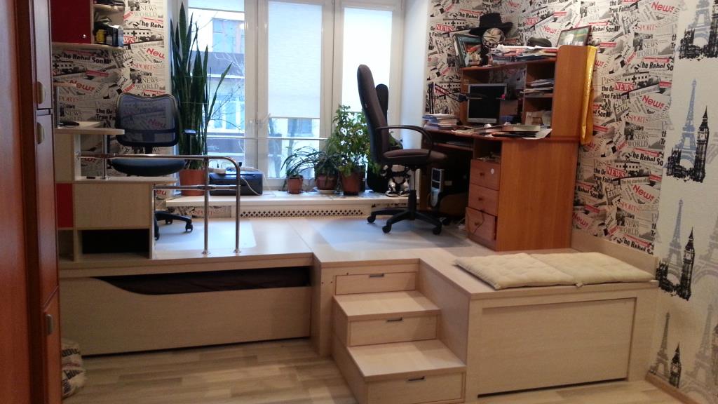 Retractable bed-podium is an interesting solution to the problem of zoning space, small in size. Someone will like the transforming table more, because the item of expenditure in this case is less; you will not have to completely redo the room.