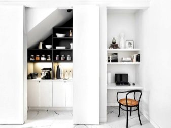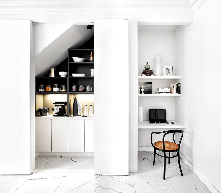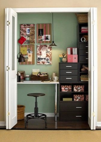 Almost every apartment has a pantry. It is usually located a little distance from the rooms, isolated. Its doors will help in a few minutes to complete the work day and hide this space from the eyes of guests. A person working at home will forget about business in a few minutes. These benefits are significant.