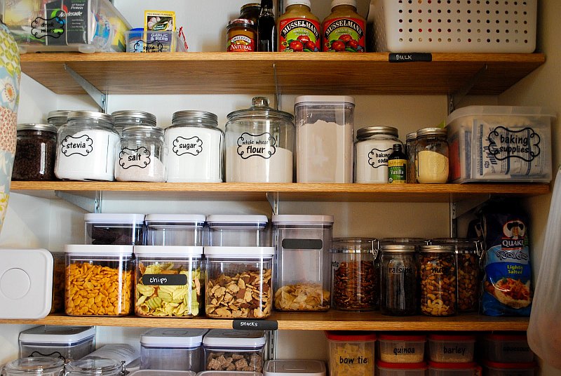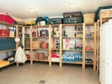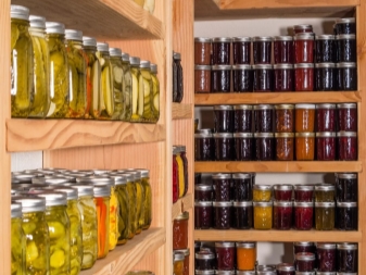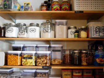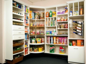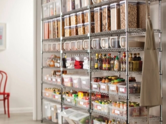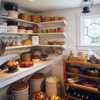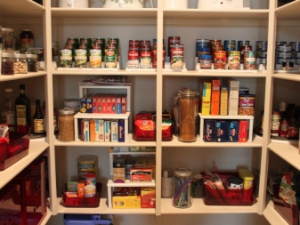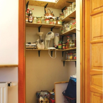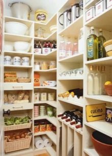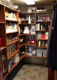 To equip the inner space as efficiently as possible, the storage space is made of shelving, shelves, the depth of which should not exceed 60 cm. The shelving is placed along the walls with the letter "P". If the pantry is narrow or placed on the balcony, then the letter "G". Rows of shelves go all the way to the ceiling. They store items that are rarely used in everyday life, as well as those that will not be broken during a fall.
