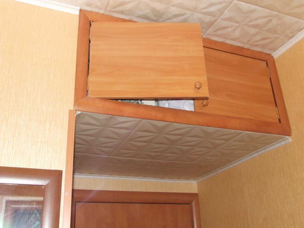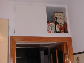 If the apartment is very small, there is no possibility to allocate some free space, then there is an option to arrange storage space under the ceiling. In the presence of a corridor between the kitchen and the rest of the rooms, the pantry is made from above along the entire aisle. It should be noted that this is not very convenient, as in order to get something, you must use the stairs.