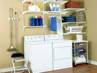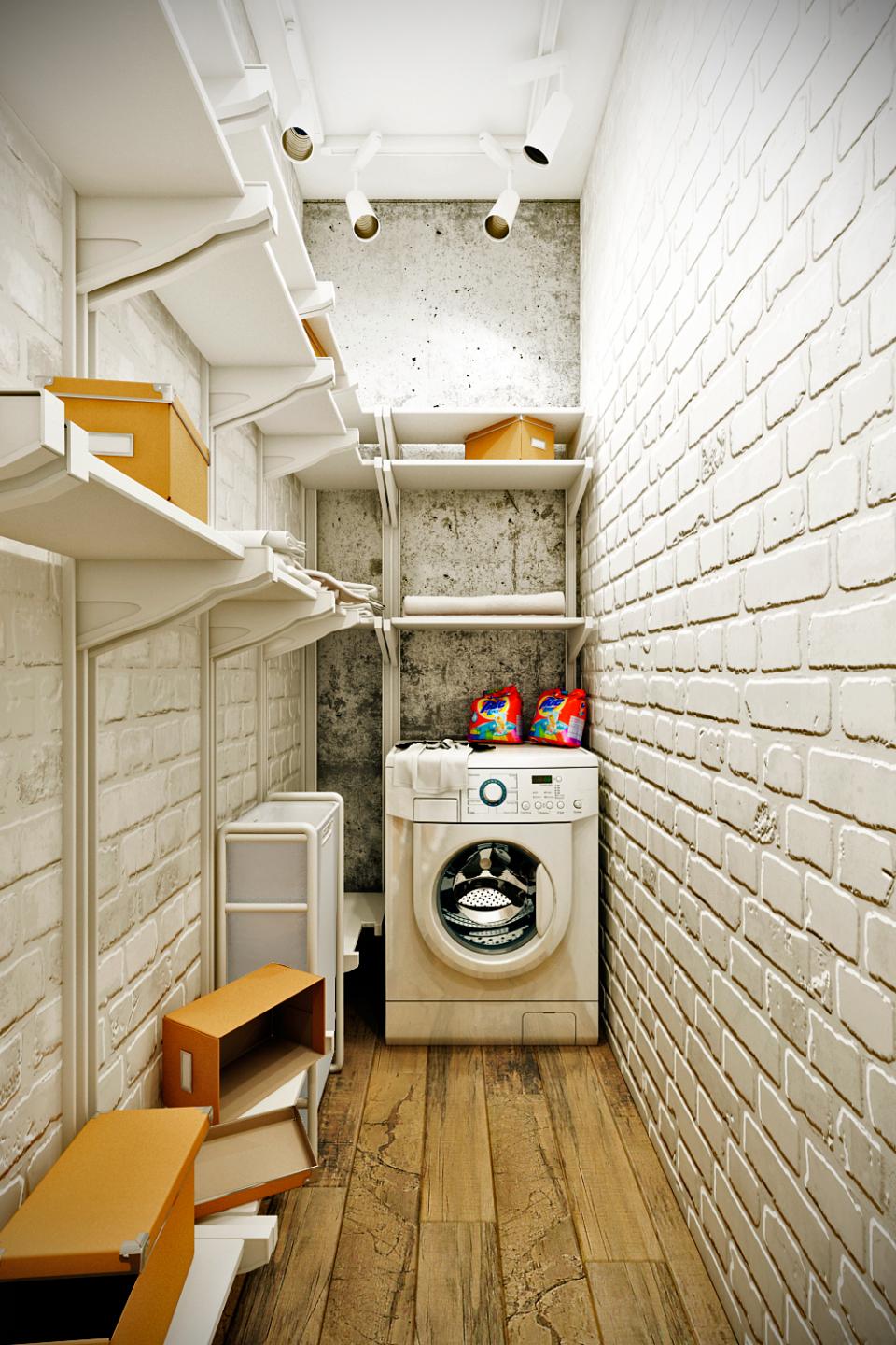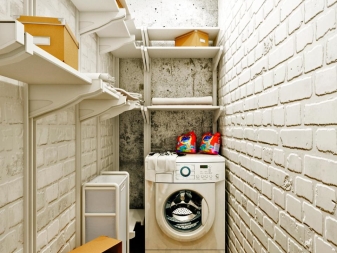 If possible, a separate corner is provided for the washing machine. In such a mini laundry you can put an iron, ironing board, containers for dirty laundry.