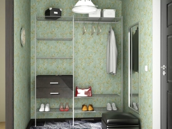 If the pantry is used as a wardrobe or it is a wardrobe, multifunctional hooks, panels for hangers, shelves, and a mirror will be an obligatory attribute of the room. As a light you can choose a small openwork chandelier or lighting.