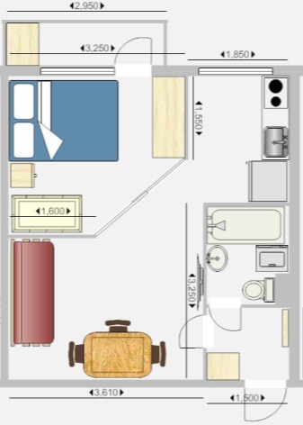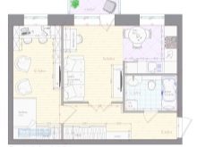 In the bathroom, to save space, the usual bath is replaced by a corner bath. The kitchen has a table with chairs, a stove and kitchen cabinets. In the living room, made of two rooms, there is a small amount of furniture: a TV, armchairs with a coffee table, a sofa and a wardrobe.