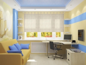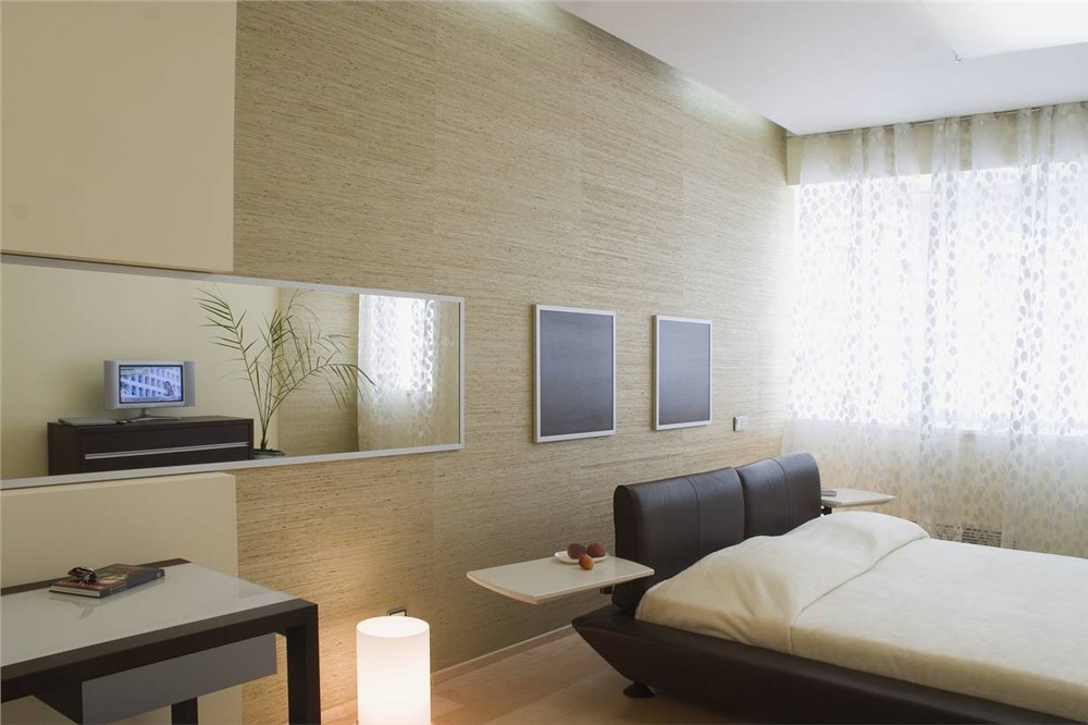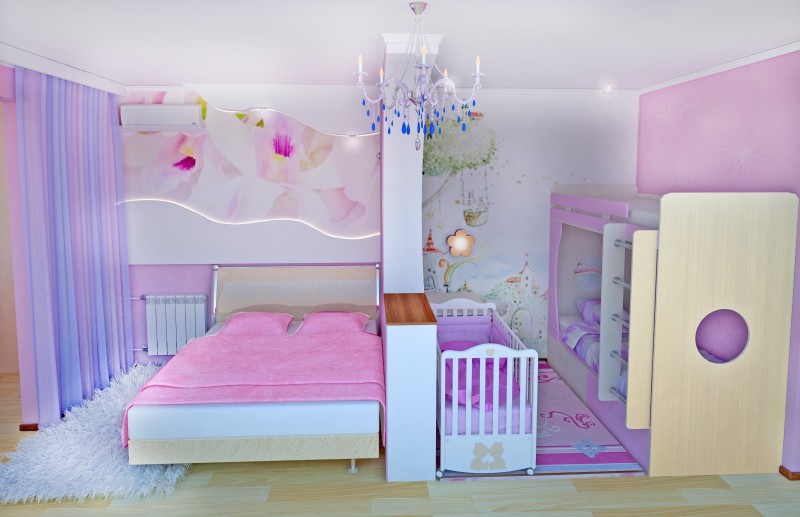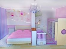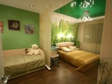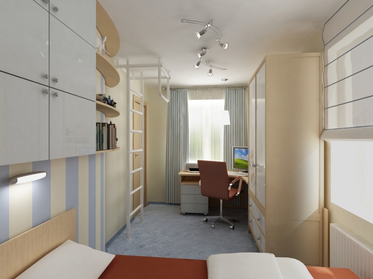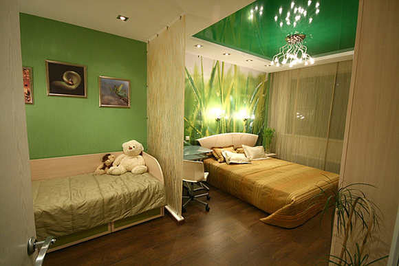 Instead of one room, two small rooms were made - a bedroom and a nursery.In the nursery there is a wardrobe for clothes, a bed and a desk with a chair. In the bedroom there is only a bed and a wardrobe. The wall between these two rooms of an unusual design, made in the form of "snake".