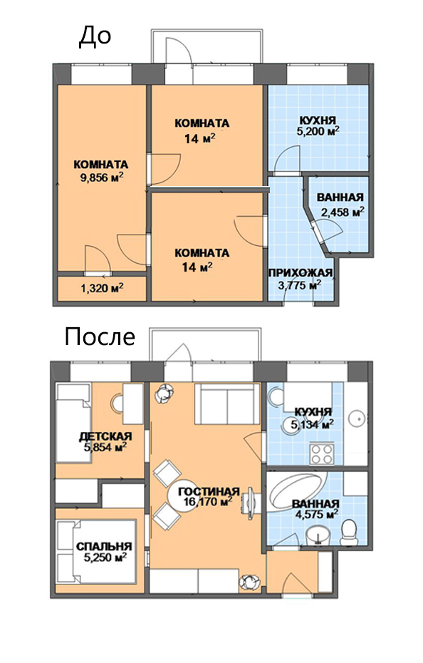 Other options for redevelopment must necessarily be agreed upon in a special inspection, and in order to avoid mistakes, it is better to entrust this matter to specialists who know all the nuances. It is best to redevelop the apartment with 3 rooms, but even with 2 and 1 room redevelopment is possible: