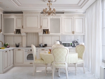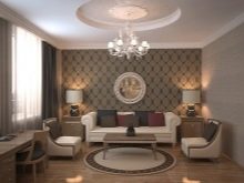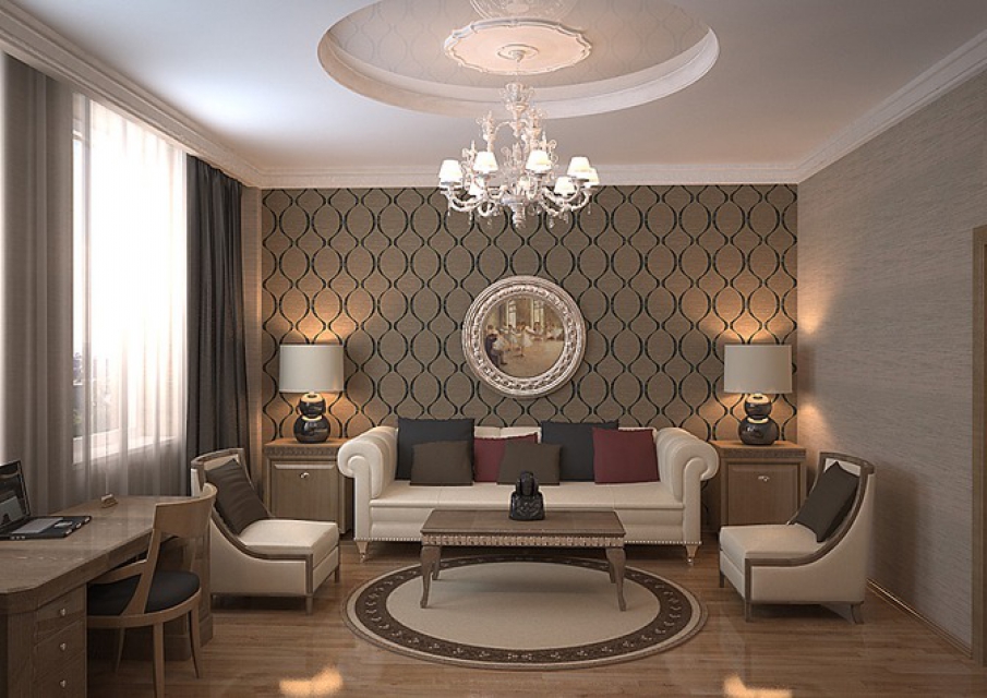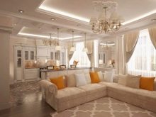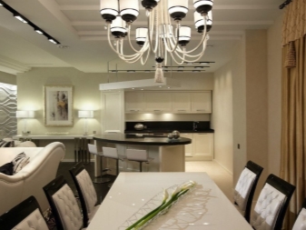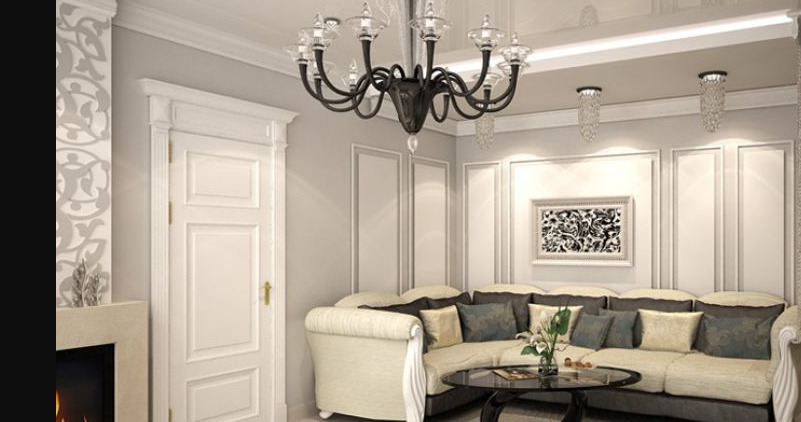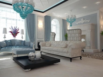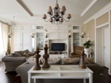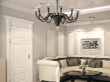 The ceiling in the room, made in neoclassical, as a rule, make out a massive chandelier. Such an emphasis will make the room more noble. By the way, this is one of the leading pieces in the neoclassical style.