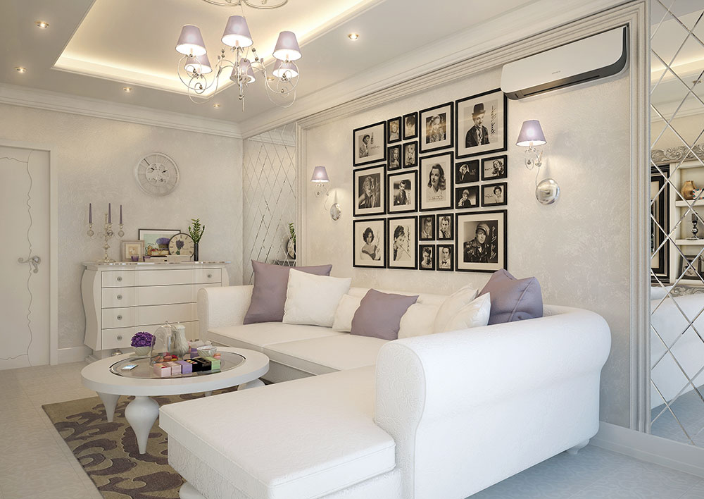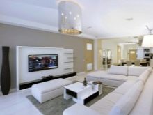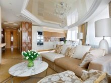 - The living room also looks great in light colors combined with white marble. This palette creates the impression of airiness of space and adds refined luxury to the room, like a palace saloon.