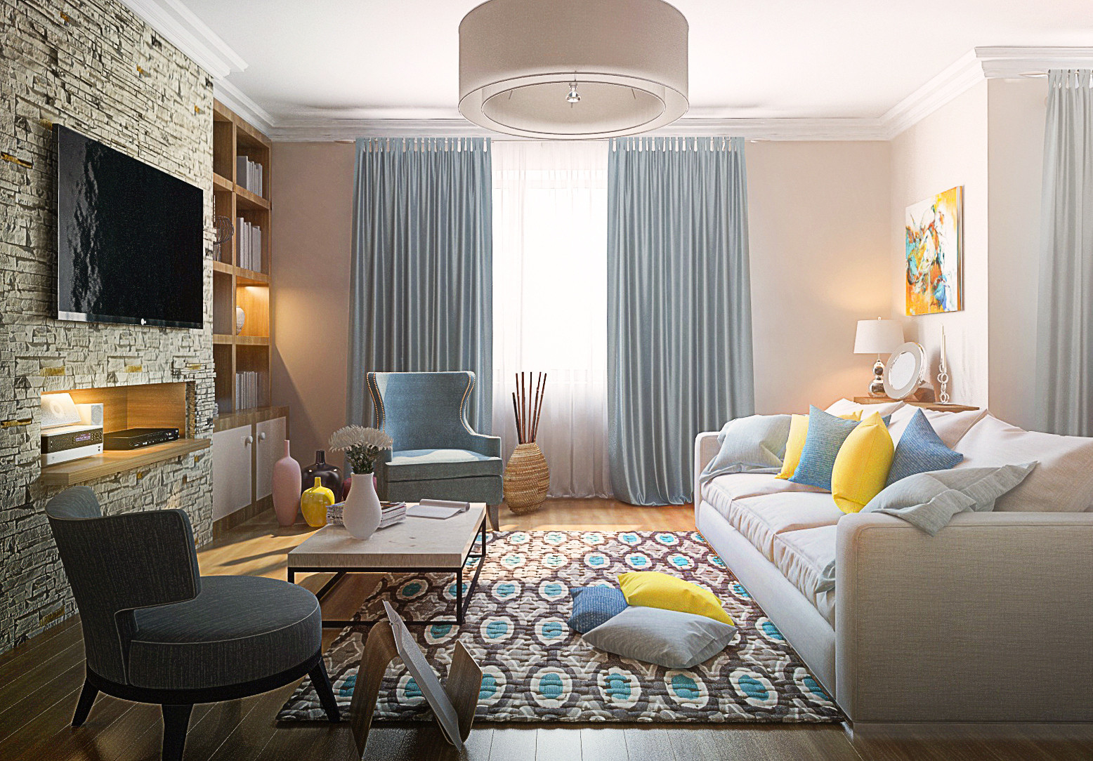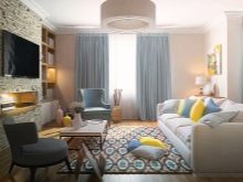 Curtains can be with an ornament or geometric shapes, and they can be completely monotonous. This is a matter of taste of each person. If you already have some kind of image on the walls, then you should limit yourself to plain curtains without pictures.