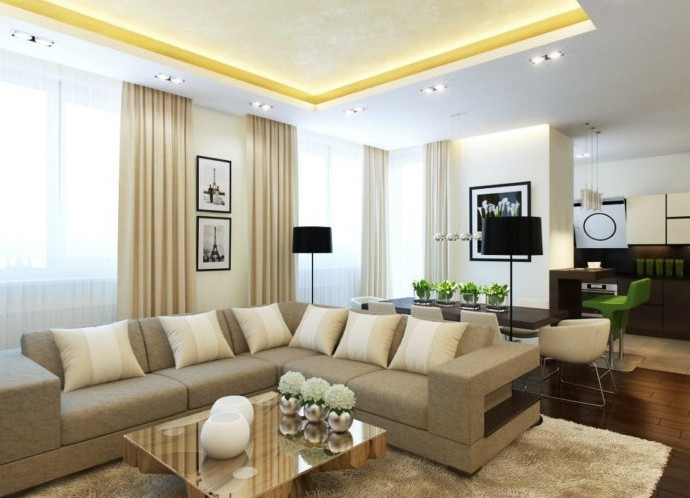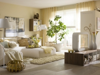 A sample of eco-style, where the leading color is beige, and auxiliary - green and black. It is noteworthy that the eco-style is characterized by the presence of green plants in the room and a carpet with a long nap. Black and white paintings dilute the boredom of solid walls, focusing on yourself.