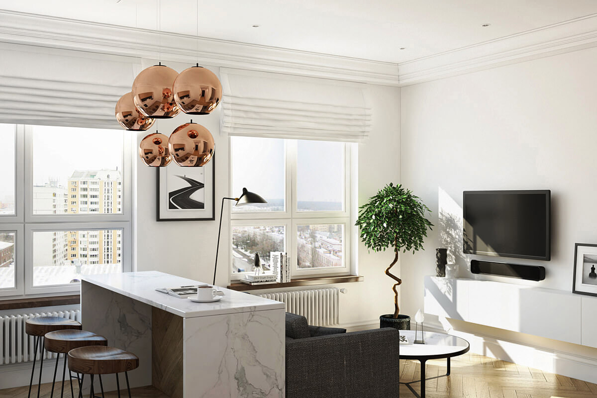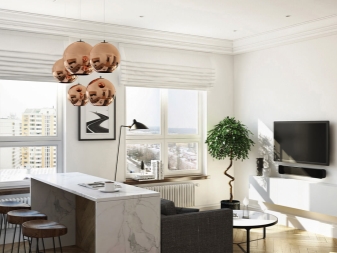 Minimalism in the interior does not lose its popularity for several years already. He leads among all directions along with neo-classicism, loft and eco. Here you see a combination of loft and eco with the strict canons of classicism. Such a living room looks extraordinary, and the marble monophonic floor and exquisite furniture, similar to the furniture of aristocratic salons, give the room a noble and discreet look.