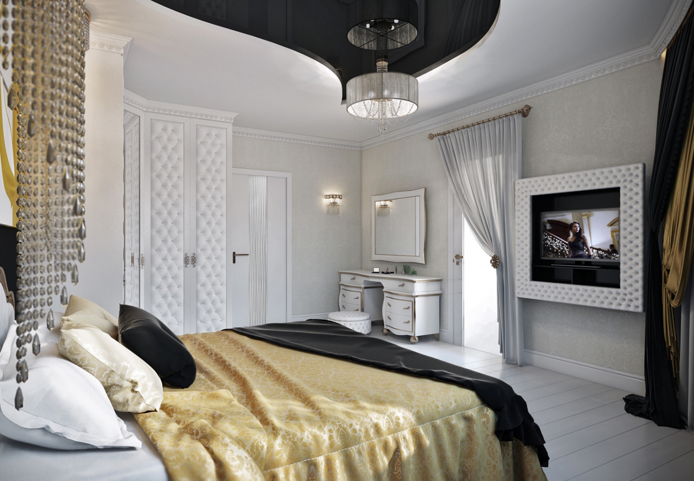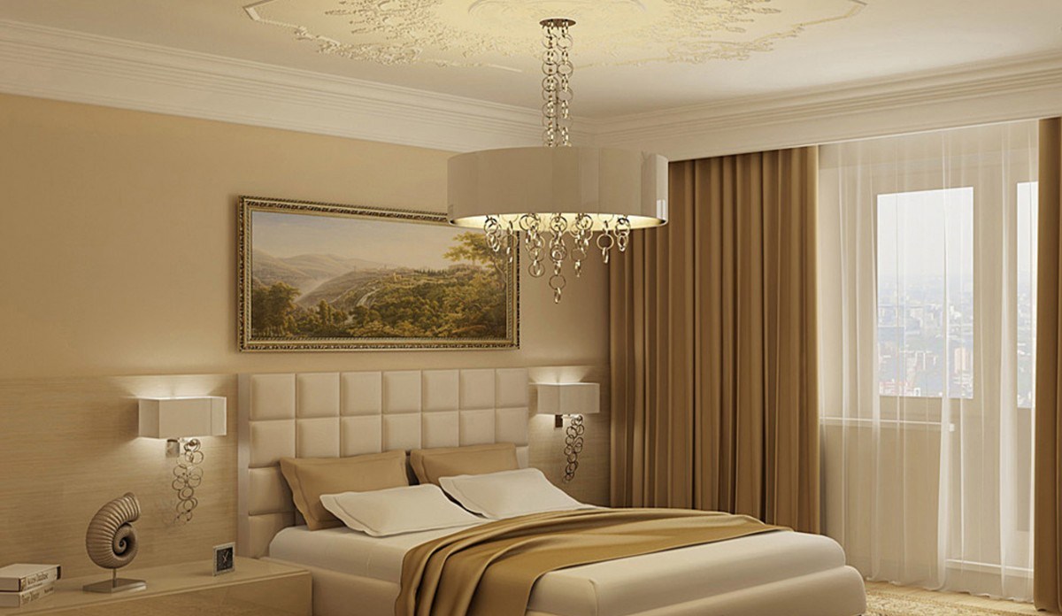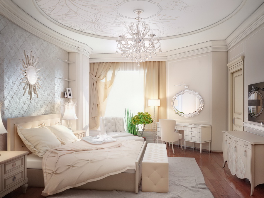 - If you hang in the bedroom, made in bright colors, a large crystal chandelier, it will look very sophisticated. Bedrooms with crystal, marble resemble fragility and at the same time lightness, royal delicacy.