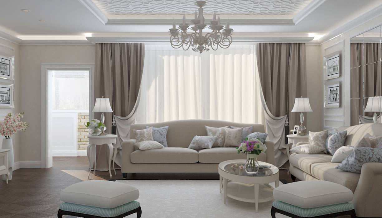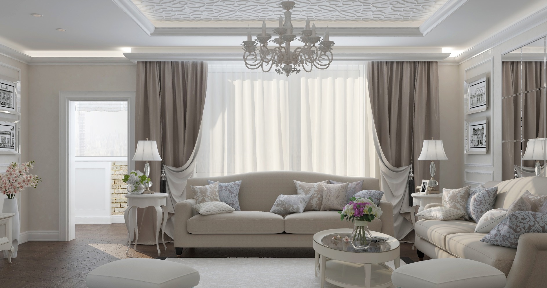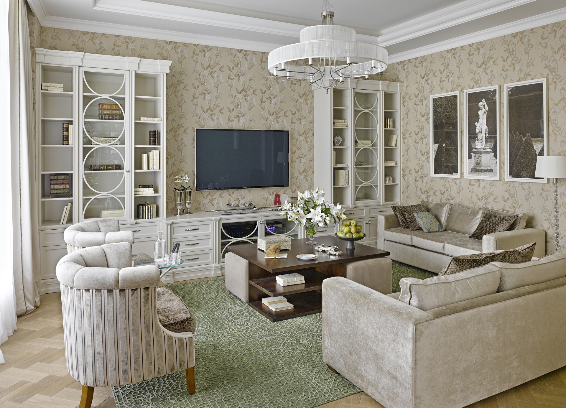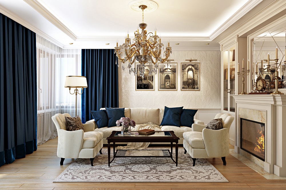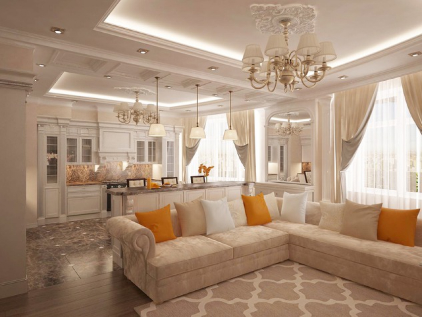 The neoclassical interior is famous for its noble restraint and at the same time the exquisite refinement of the decor and the overall design as a whole. The leading shade of this living room is milky, auxiliary - black and beige.The perfect example of a competent combination of light and dark colors.