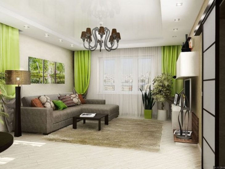 No less popular is eco style. It is characterized by light natural shades that evoke thoughts about nature.It can be beige, light green, lime. This style, like minimalism, does not tolerate excesses. The ceiling is usually decorated with simple lamps or chandeliers without decorative excesses.