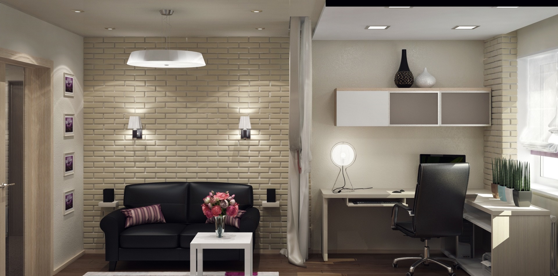 Modern style, which combines the elements of the loft, namely the walls, made under the stone, and the elements of minimalism. An example of a competent combination of different styles and color palette. Leading color - beige. Adding black as a contrast gives a special mood to the room.