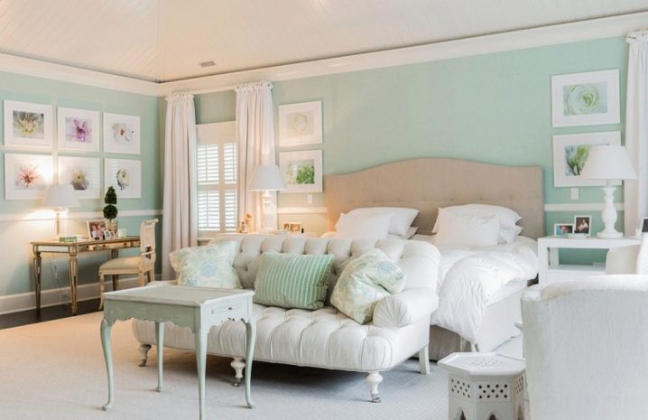 Light furniture of cold shades like mint, heavenly, pale cornflower blue goes well with white, beige color and its shades. Such a tandem will give the room a fresh look, will bring considerable pleasure to the owners, since such colors relax, give a state of peace and have a beneficial effect on the nervous system.